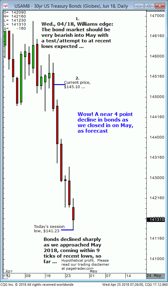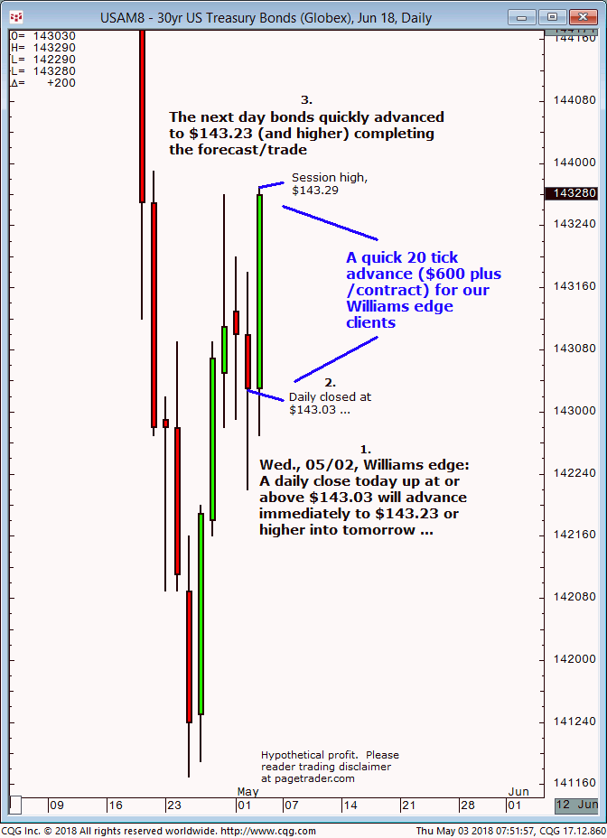 June 30 year U.S. Treasury bond: 1. In last Wednesdays (05/02) Williams that session it was noted that a daily close at or above $143.03 could be bought for an advance to $143.23 or higher into the following day. 2. Subsequently, the daily closed at $143.03 and the very next day completed the $143.20 upside […]