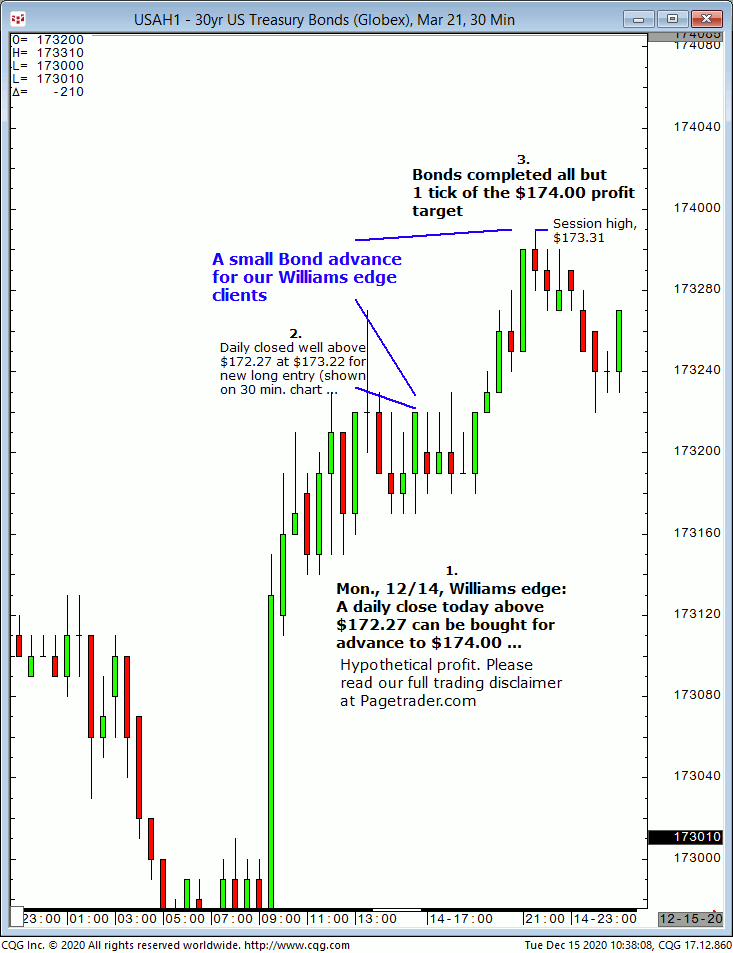 Our Wed., 12/16 Bond forecast was for new long entry upon daily close above $172.20, for advance to $173.18 profit target. Results? Bonds closed above $172.20 and today completed the $173.18 profit target (session high, $173.22)!