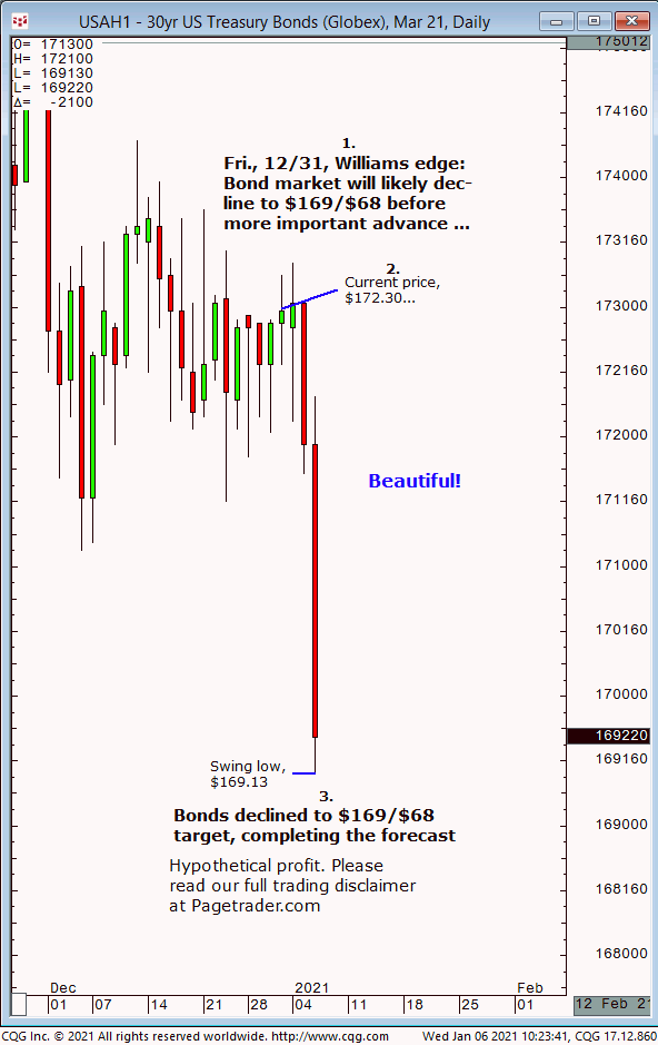 With bonds trading at $172.30 our Fri., 12/31 bond forecast indicated further decline to $169/$68. Results? Bonds declined sharply and today completed the $169/$68 target (swing low, $169.13)!
