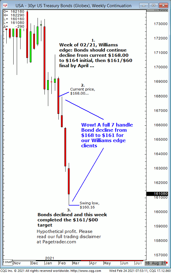 Our week of 02/21 Bond forecast indicated decline from $168.00 to $164 initial, then $161/$60 final by April. Results? Bonds declined sharply and this week completed the $161/$60 target! Subscriber forecast cost, approx. $24.00.