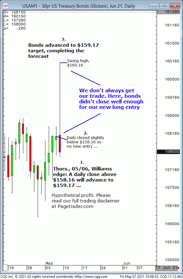 Our Thur., 05/06 Bond forecast indicated new long entry upon a daily close above $158.16 for advance to $159.17. Results? Bonds closed below $158.16, at $158.14, so no new entry. However, bonds did complete the $159.17 target!