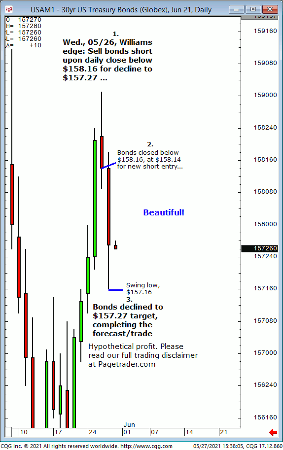 Our Wed., 05/26 Bond forecast was for new short entry upon daily close below $158.16, for decline to $157.27 target. Results? Bonds closed below $158.16 (at $158.14) and today completed the $157.27 target (swing low, $157.16)!