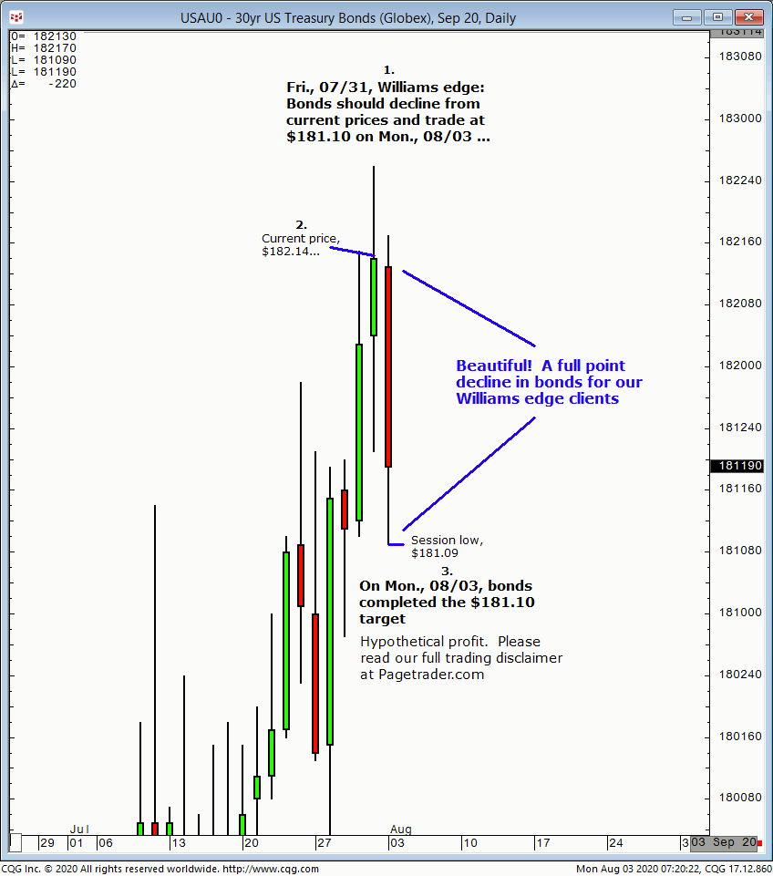 September 30 year US treasury bond: 1. In Friday’s 07/31 Williams edge session it was noted that bonds (then trading at $182.14) should decline and trade at $181.10 on Mon., 08/03. 2. Subsequently, bonds declined and on Mon 08/03 completed the $181.10 profit target (swing low, $181.09). This successfully completes the forecast/trade. David Williams