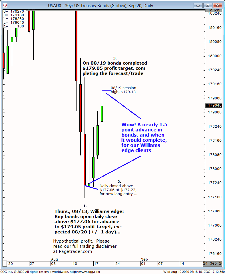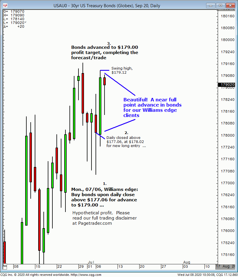 30 year September U.S. Treasury bond: 1. In Monday’s 07/06 Williams edge session it was noted to buy September bonds upon a daily close above $177.06 for a tradable advance $179.00 profit target. 2. Subsequently, bonds closed above $177.06, at $178.02 for new long entry. The market than advanced and completed the $179.00 profit target,