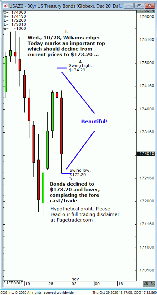 Our Wed., 10/28 session noted that bonds had topped at $174.29 and an important decline would occur to $173.20. Results? Bonds subsequently declined and completed the $173.20 target (and lower). David Williams