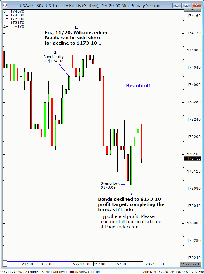 Our Fri., 11/20 bond forecast indicated new short entry at $174.02 for decline to $173.10. Results? Bonds declined and completed the $173.10 profit target (session low, $173.09)!