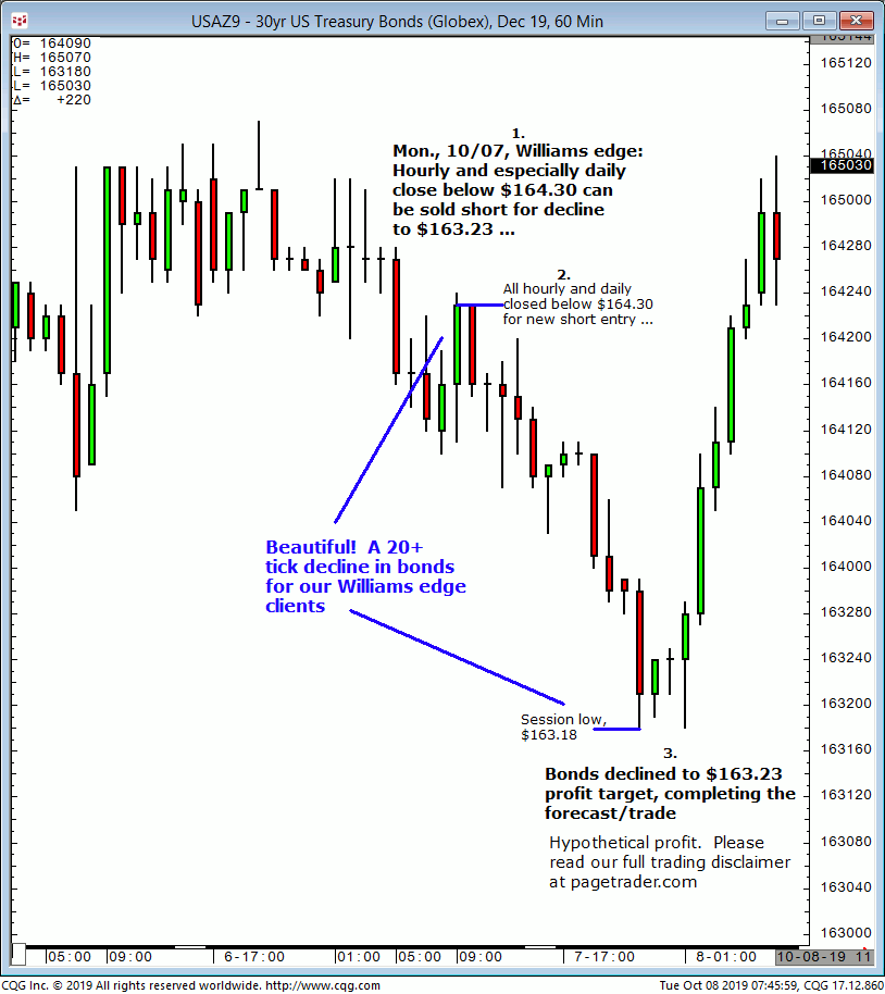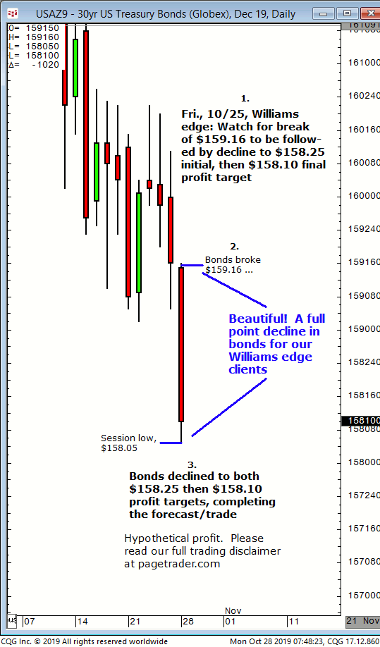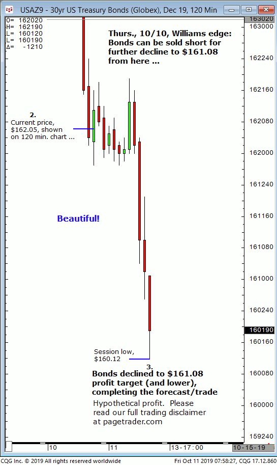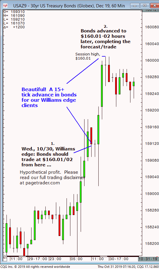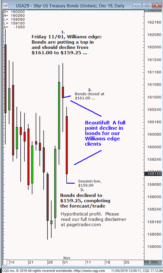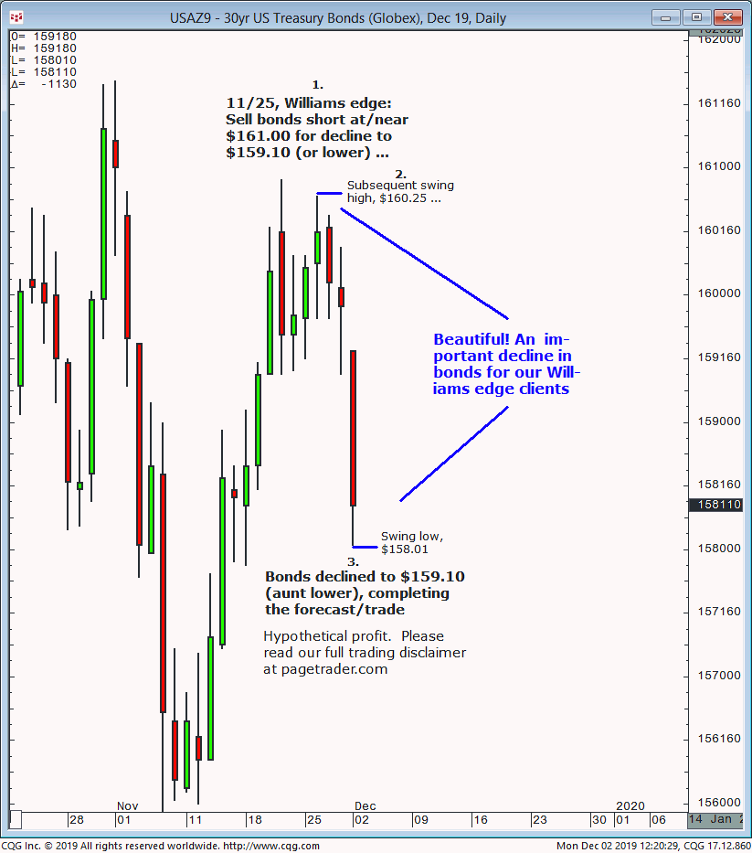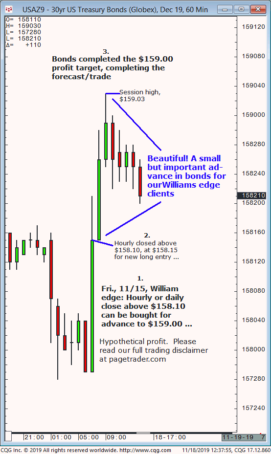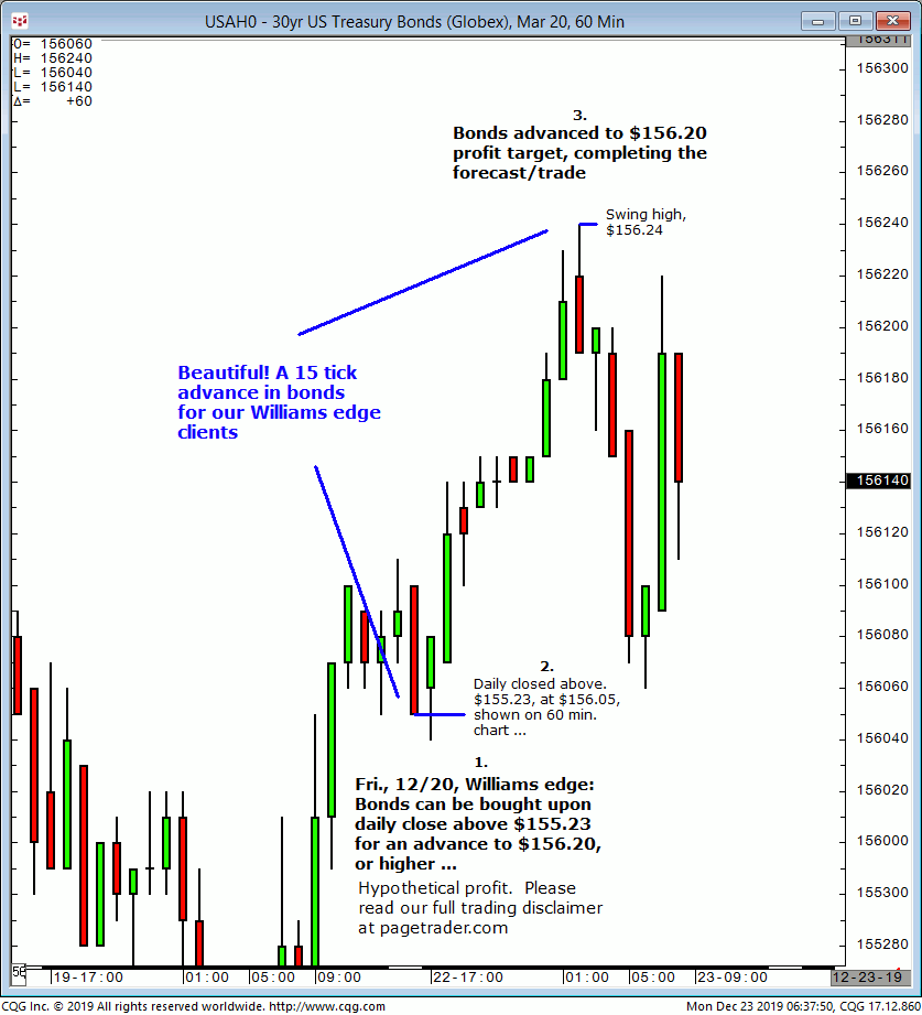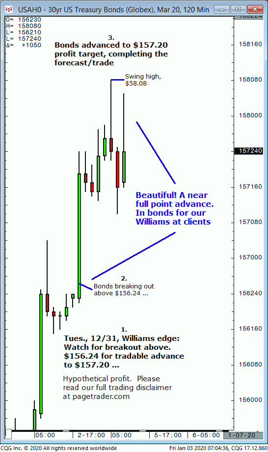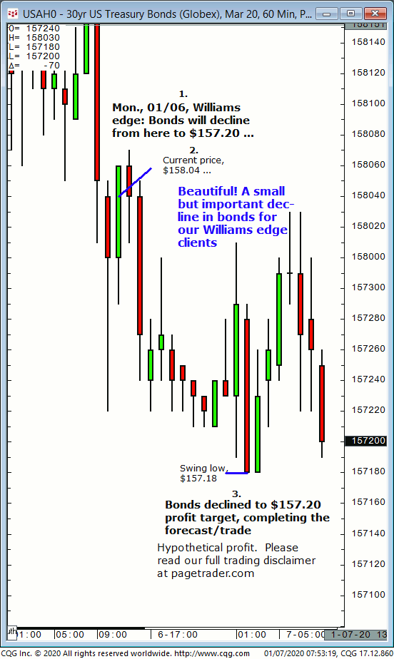 March 30 year US treasury bond: 1. In Mondays 01/06 Williams edge session it was noted that bonds (then trading at $158.04) would decline down to $157.20. 2. Subsequently, bonds declined and completed the $157.20 profit target (swing low, $157.18). This successfully completes the forecast/trade. David Williams