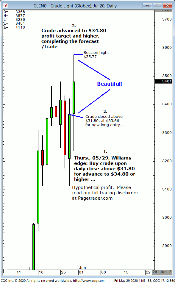 July crude: 1. In Thursday’s 05/29 Williams edge session it was noted to buy crude oil upon a daily close above $31.80 for advance to $34.80 or higher. 2. Subsequently, crude closed above $31.80, at $33.66 for new long entry. Crude then continued higher and the following day completed the $34.80 profit target. This successfully