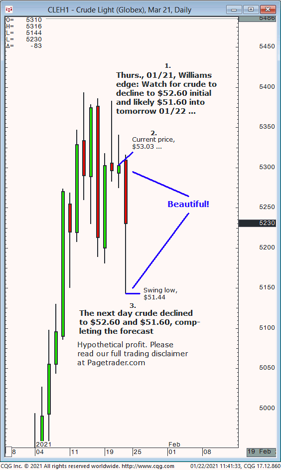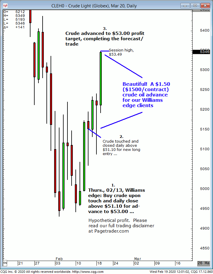 March crude oil: 1. In Thursday’s 02/13 Williams edge session it was noted to buy crude oil upon a daily close above $51.10 for advance to $53.00. 2. Crude touched and close daily above $51.10 for new long entry. Several days later crude completed the $53.00 profit target. The successfully completes the forecast/trade. David Williams