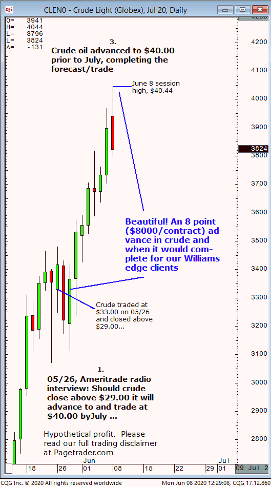 July crude oil: 1. On 05/26 we noted that if crude closed above $29.00 it would advanced to $40.00 by July. 2. Subsequently, crude closed each day and week above $29.00 and on 06/08 July crude completed the forecast $40.00 profit target (session high, $40.44). This successfully completes the forecast/trade. David Williams