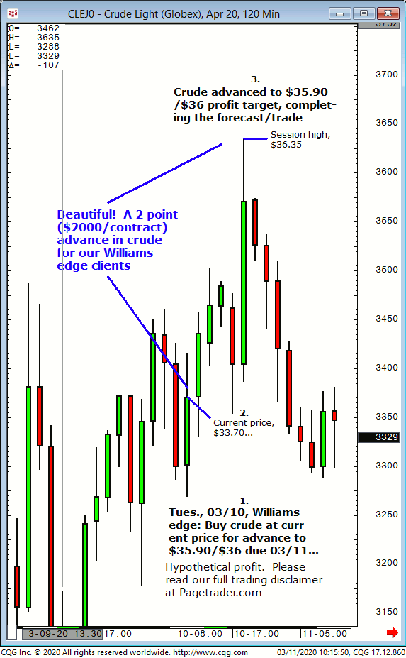 April crude oil: 1. In Tuesday’s 03/10 Williams edge session it was noted to buy April crude at the current price of $33.70 for advance to $35.90/$36.00 expected on 03/11. 2. Subsequently, crude oil advanced from $33.70 and completed tthe $35.90/$36.00 profit target (swing high $36.35). This successfully completes the forecast/trade. David Williams