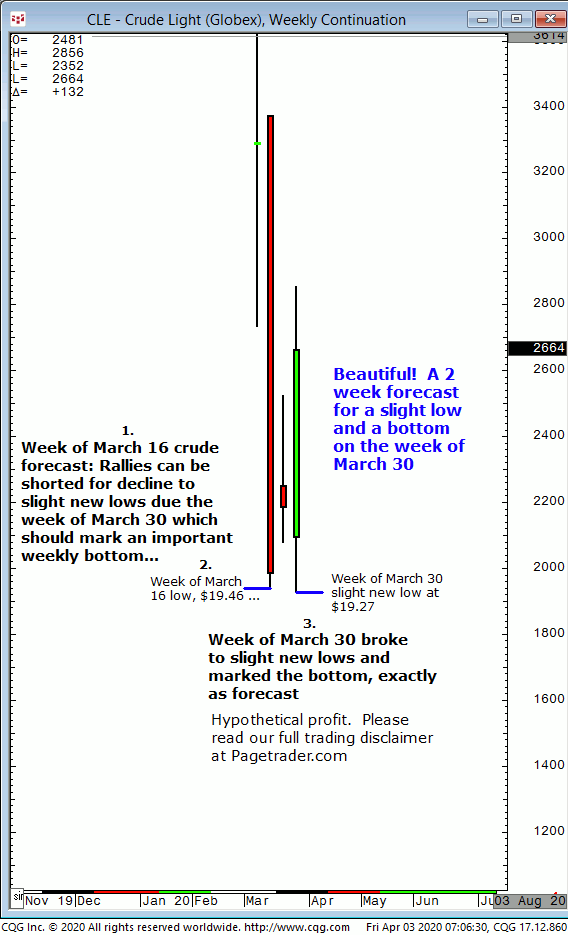 Crude oil: 1. During the week of March 16 our crude oil forecast indicated that any rallies could be shorted for a further decline to slight new lows below $19.46 expected to occur into the week of March 30. That week would also mark an important weekly bottom, according to the forecast. 2. Subsequently, the