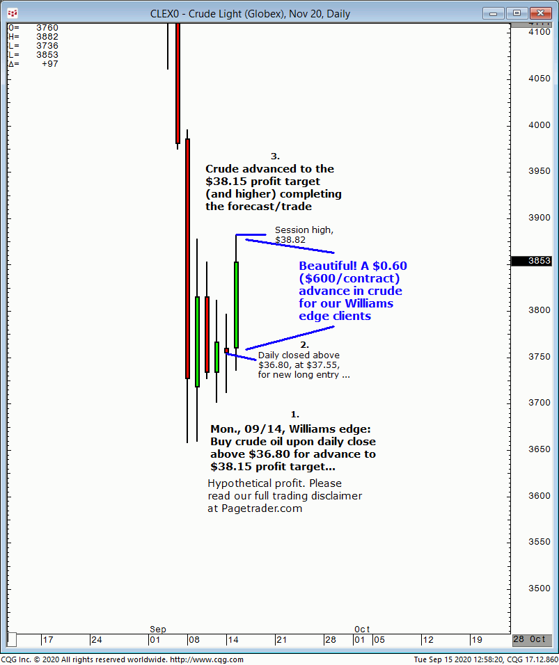 Our Mon., 09/14 crude oil forecast indicated new long entry upon a daily close above $36.80, for advance to $38.15 profit target. Results? Crude closed the day above $36.80, at $37.55 and today completed the $38.15 profit target (session high, $38.82)!