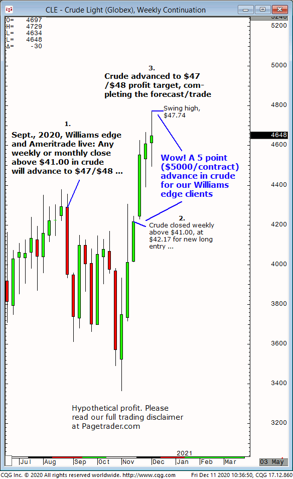 Since Sept., our crude forecast was that weekly or monthly close above $41.00 could be bought for advance to $47/$48 profit target. Result? Crude closed weekly above $41.00 then completed the $47/$48 profit target (swing high, $47.74)!