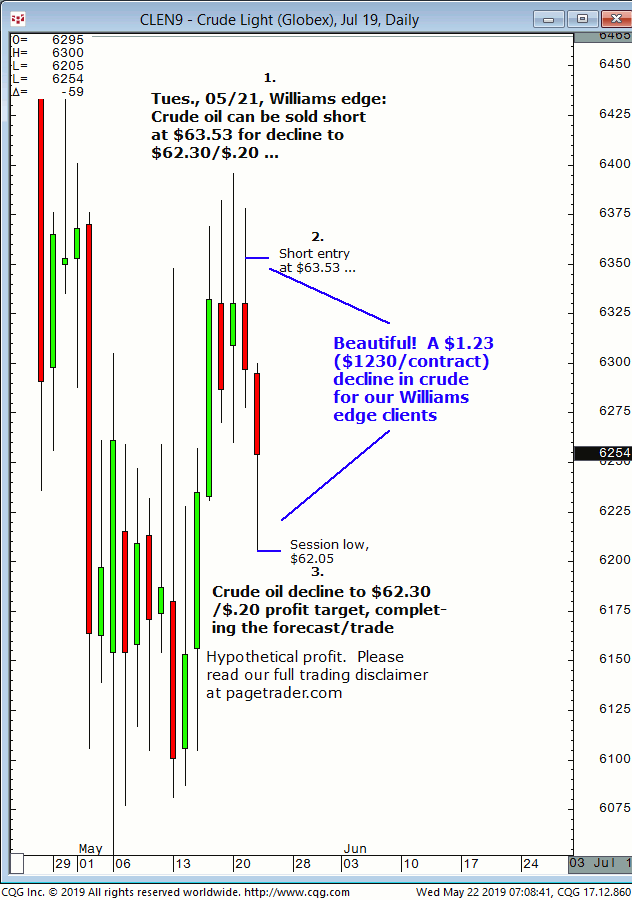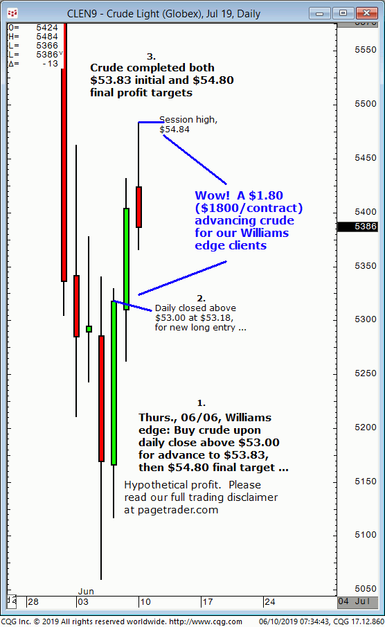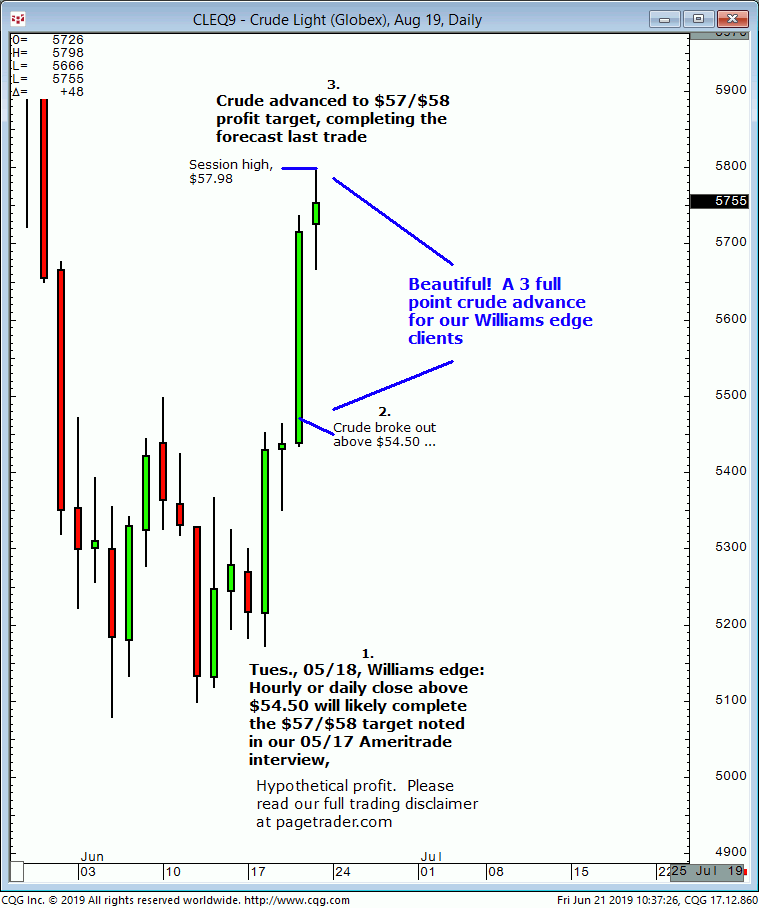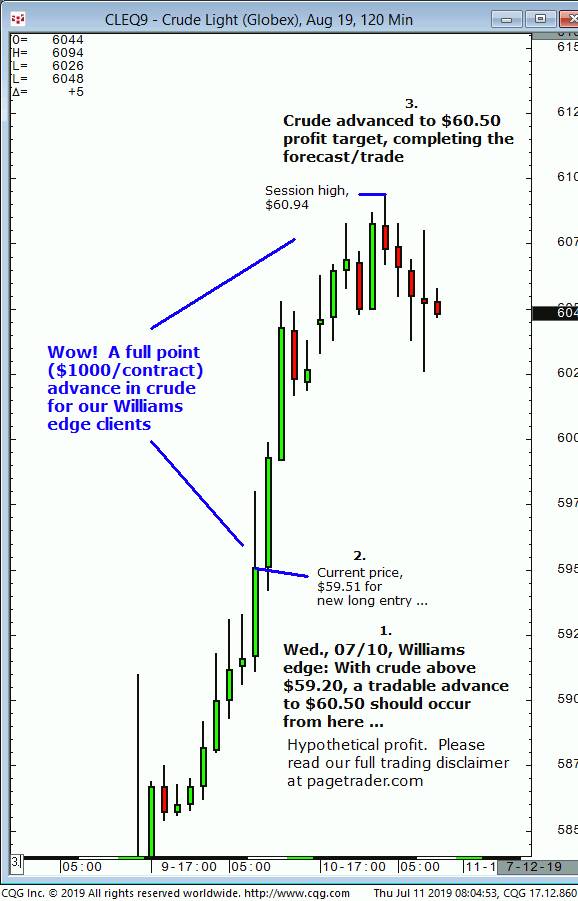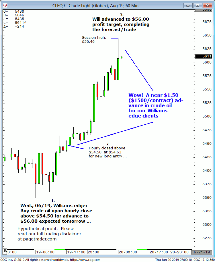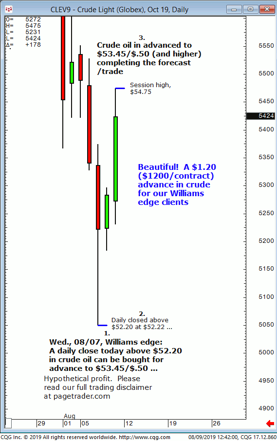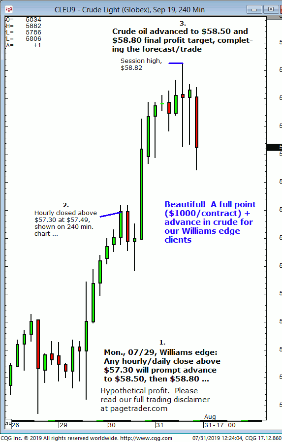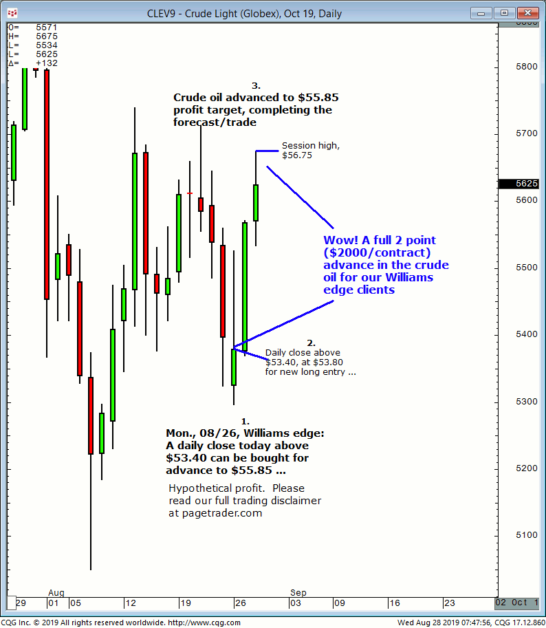 October crude oil: 1. In Monday’s 08/26 Williams edge session it was noted that a daily close that session above $53.40 could be bought for advance to $55.85. 2. Subsequently, the day closed above $53.40, at $53.80 for new long entry. The market than advanced and completed the $55.85 upside target (swing high, $56.75). This […]
