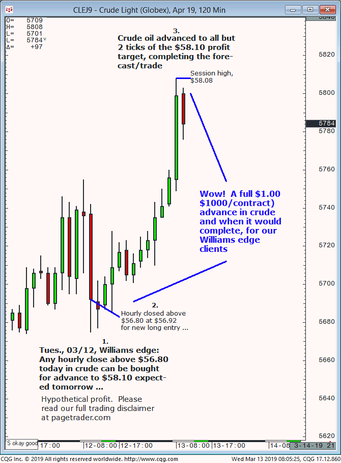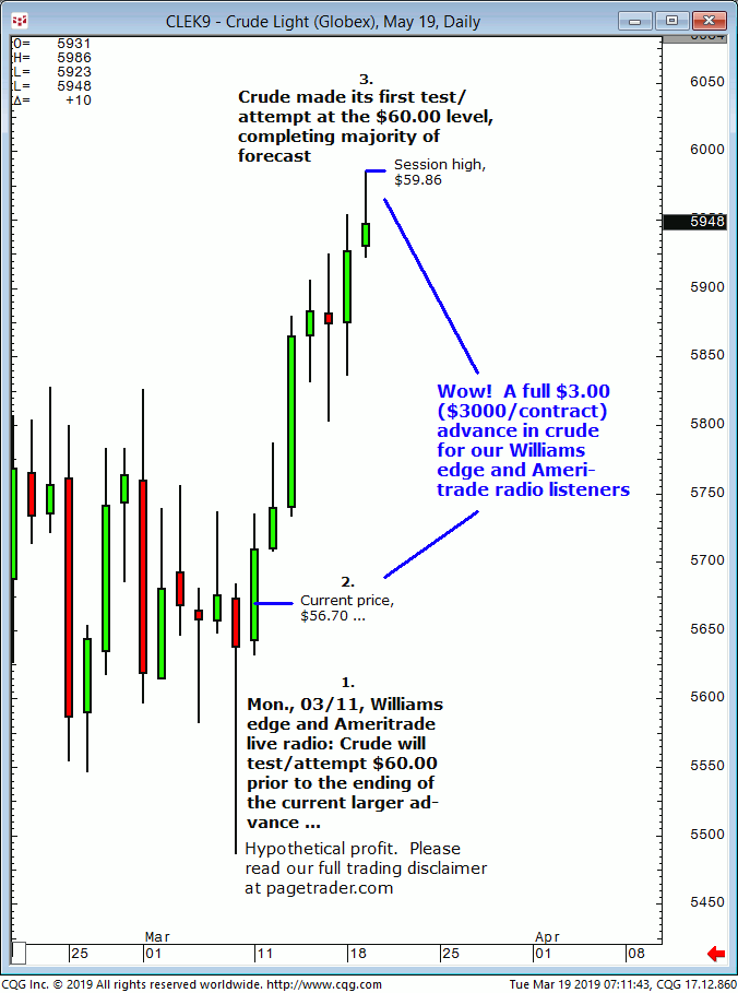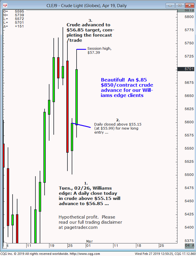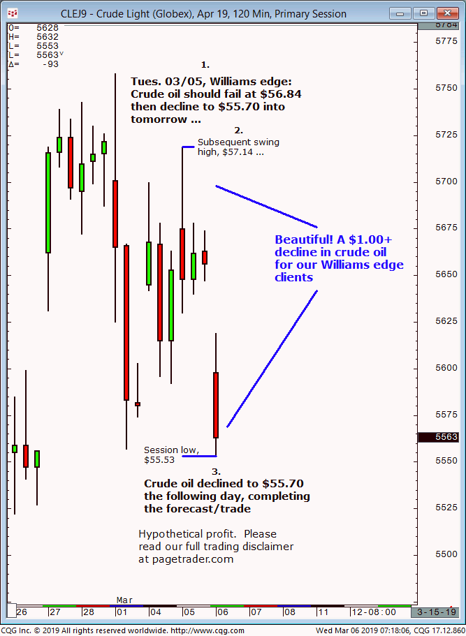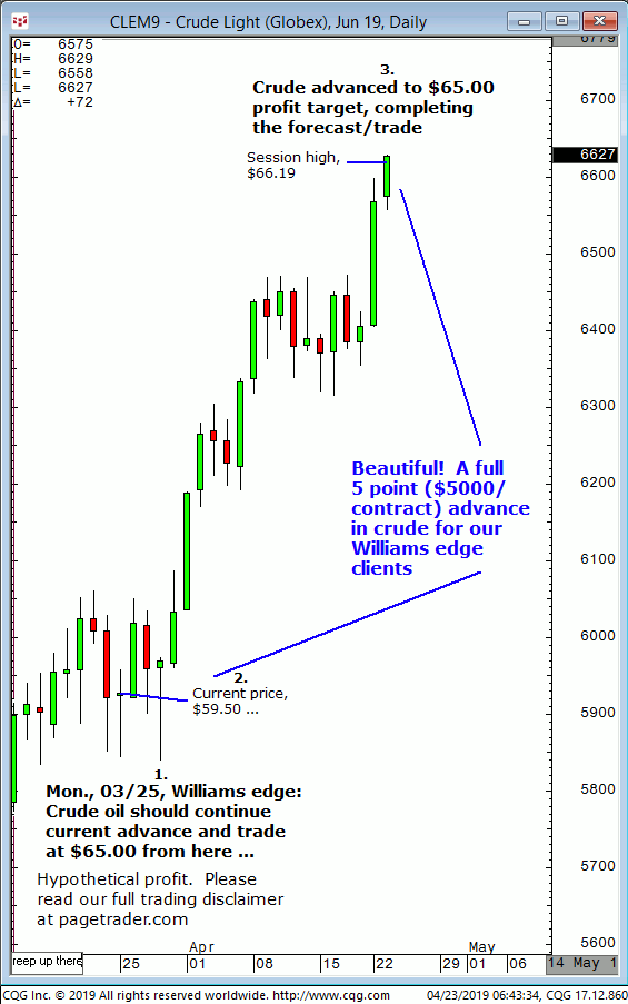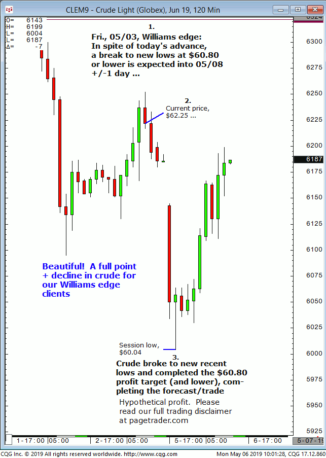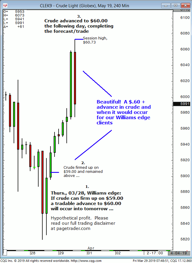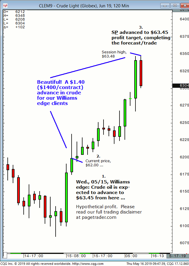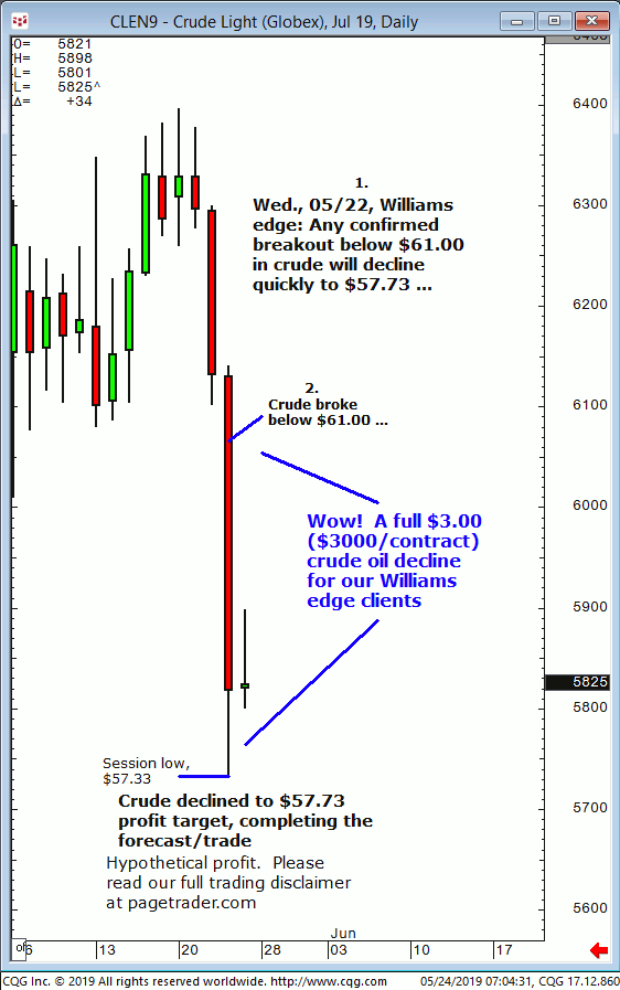 July crude oil: 1. In last Wednesdays (05/22) Williams edge session it was noted that any confirmed breakout below $61.00 in crude would provide a tradable decline to $57.73. 2. Subsequently, crude broke below $61.00 and quickly declined and completed the $57.73 downside target (swing low, $57.33). This successfully completes the forecast/trade. David Williams