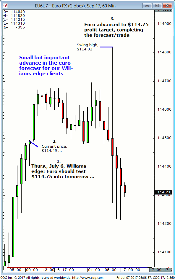 September euro: 1. In yesterday’s (Thursday, July 6) Williams edge live meeting it was noted that the September euro (then trading at approximately $114.49) was expected to continue to advance and test $114.75 into Friday, June 7. 2. Subsequently, the September euro advanced and today (Friday, July 7) completed the $114.75 upside target (today’s session […]