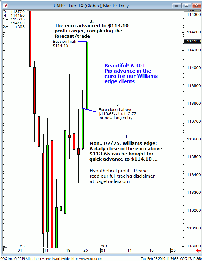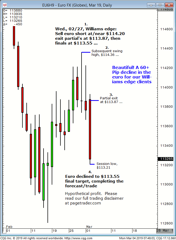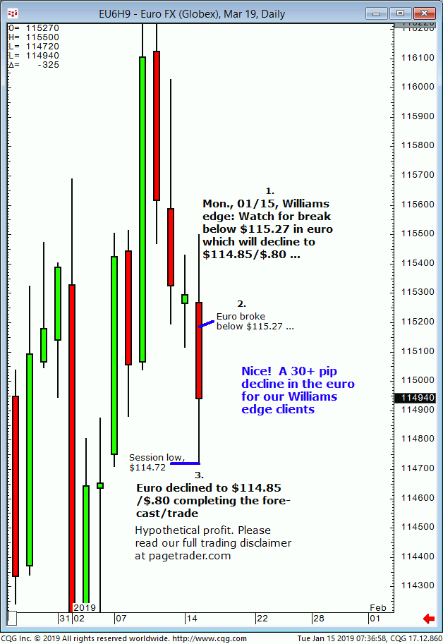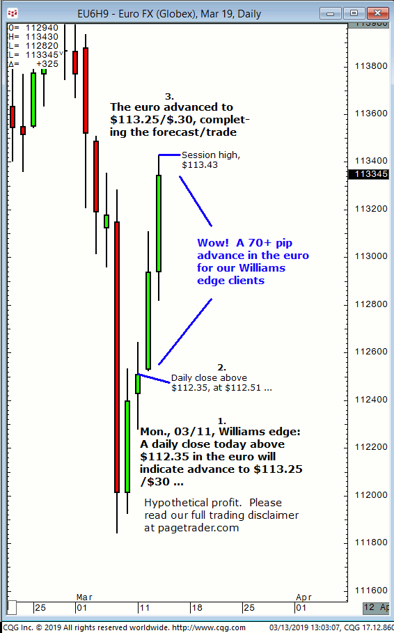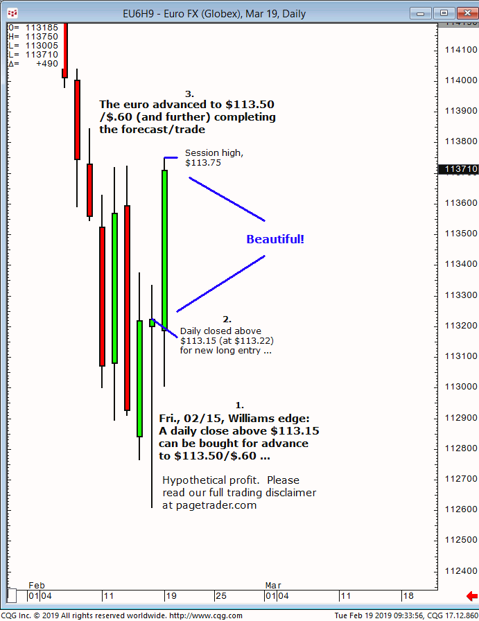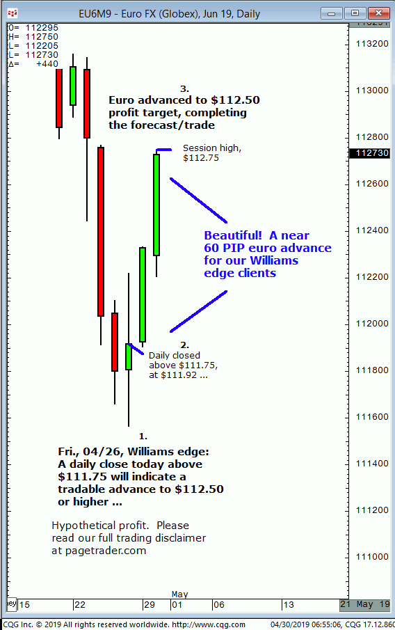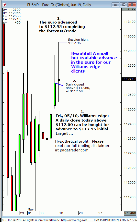 June euro: 1. In last Friday’s (05/10) Williams edge session it was noted that a daily close that session above $112.60 could be bought for a tradable advance to $112.95 initial target. 2. Subsequently, the euro advanced and completed the $112.95 target (session high, $112.96). This successfully completes the forecasts/trade. David Williams