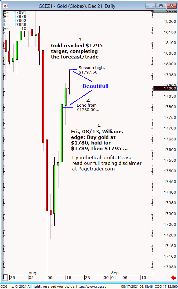 Our Fri., 08/13 gold call was for new long entry at $1780 for advance to $1795. Result? Gold advanced and today completed the $1795 target (session high, $1797.50)! Trial at: https://pagetrader.com/market-forecasting-products/williams-edge-futures-and-plus-1-week-trial/
