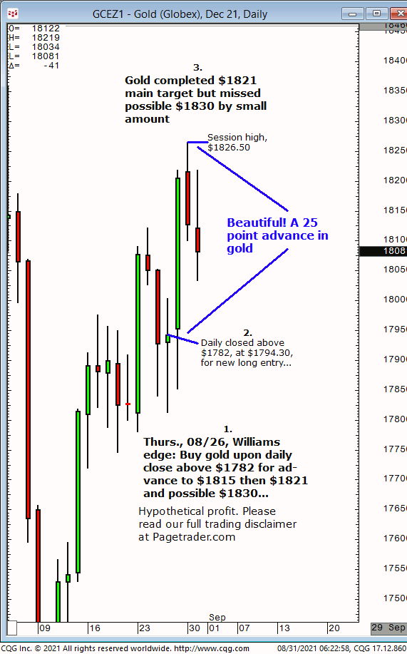 08/26: Buy gold on daily close above $1782 for run to $1821 and possible $1830. Result? Gold closed above $1782 and ran to $1821 and most of $1830. Trial at: https://pagetrader.com/market-forecasting-products/williams-edge-futures-and-plus-1-week-trial/