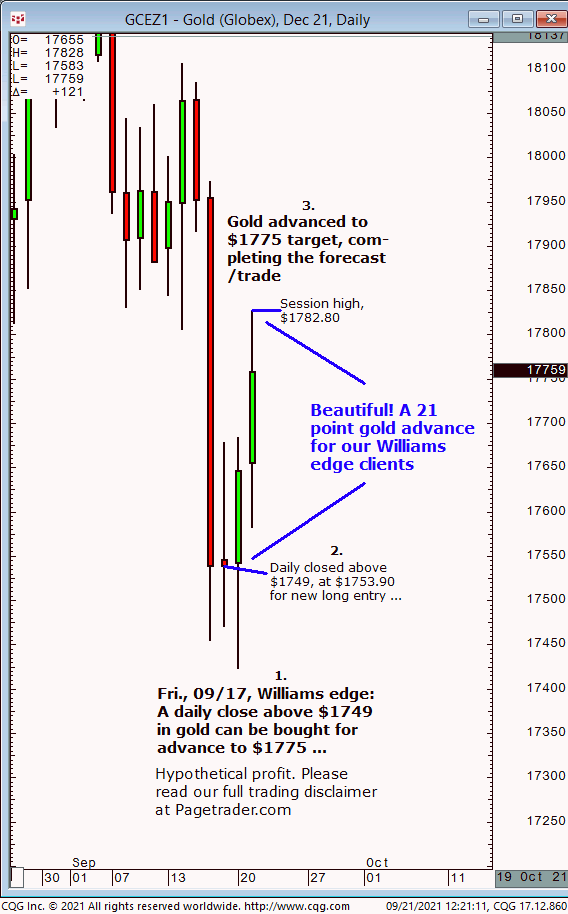 Fri., 09/17 forecast: Buy gold upon daily close above $1749 for advance to $1775. Results? Gold closed above $1749 and today completed $1775! https://pagetrader.com/market-forecasting-products/williams-edge-futures-and-plus-1-week-trial/
