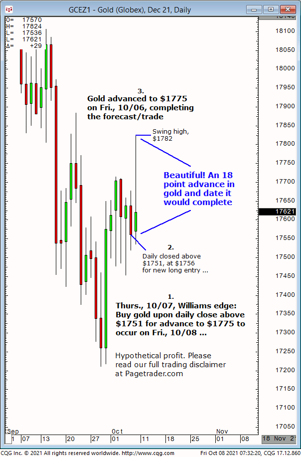 Thurs., 10/07: Buy gold upon daily close above $1751 for advance to $1775 due Fri., 10/08. Result? Gold closed above $1751 and today hit the $1775 target! Trial at: https://pagetrader.com/market-forecasting-products/williams-edge-futures-and-plus-1-week-trial/