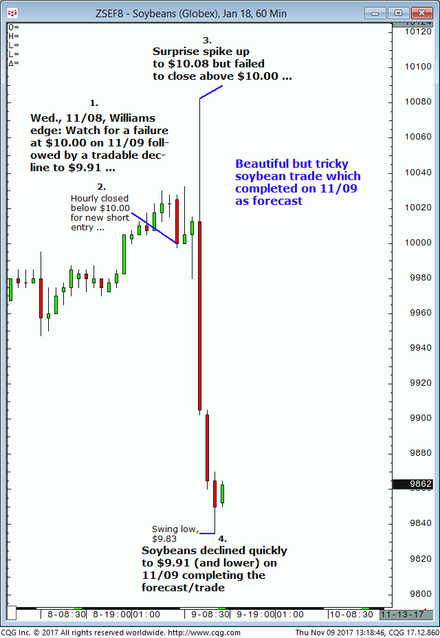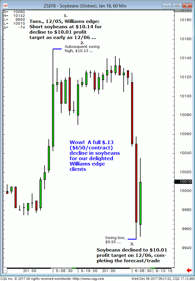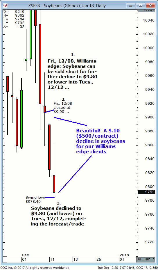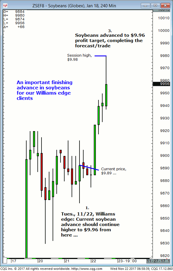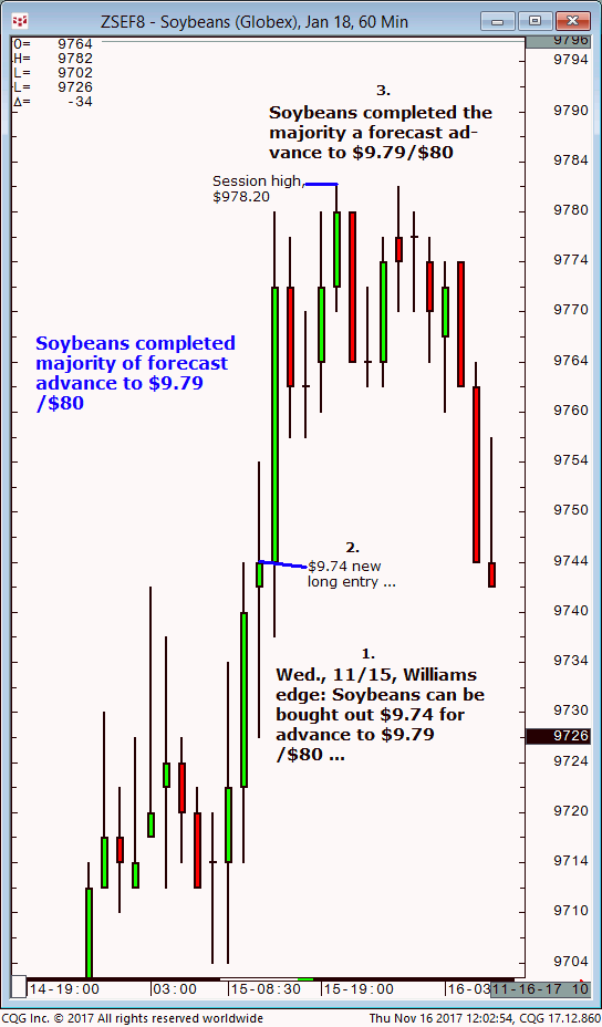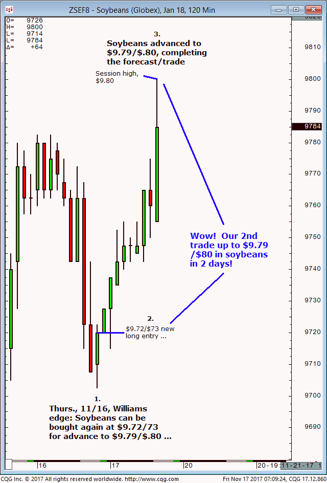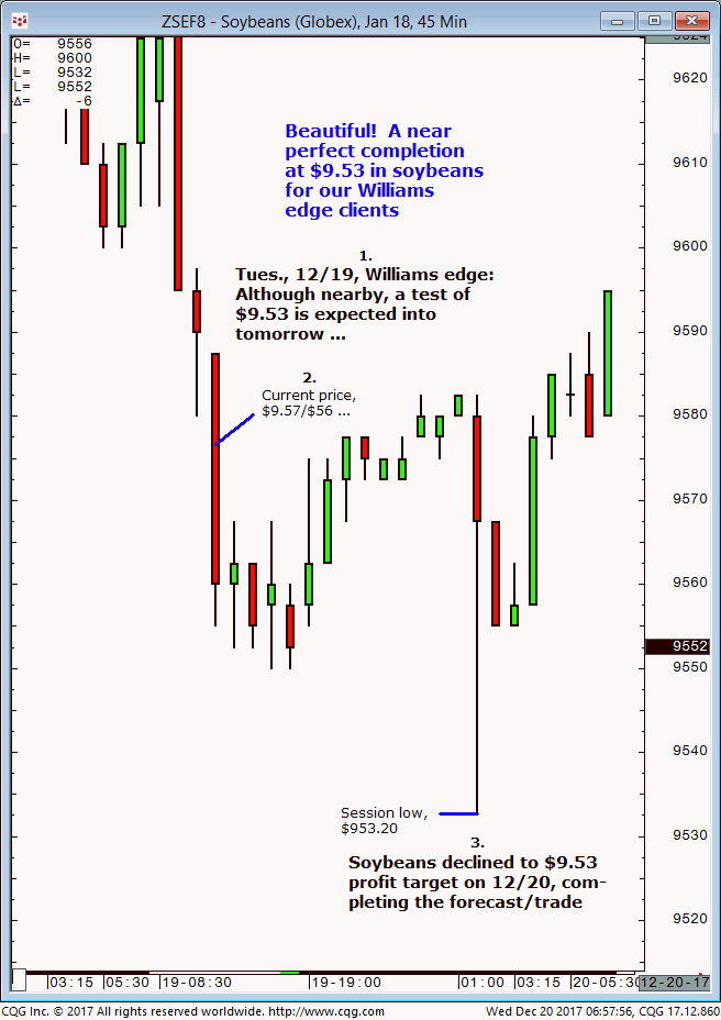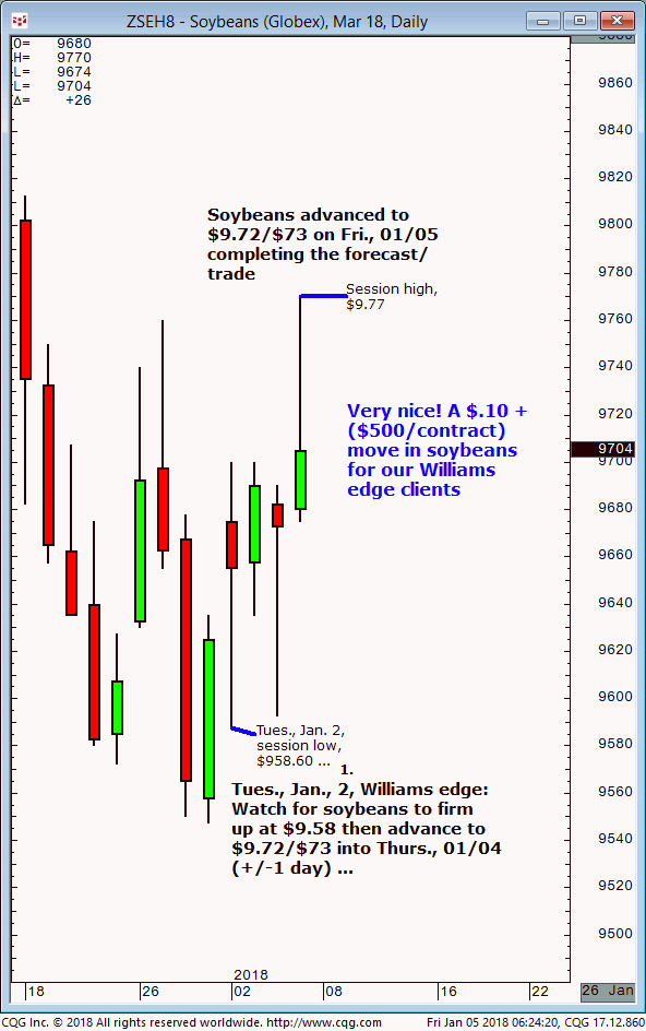 March soybeans: 1. In last Tuesdays (January 2) Williams edge live meeting it was noted that March soybeans were expected to firm up on $9.58 then advance to $9.72/$73 into Thursday 01/04 (+/-1 day). 2. Subsequently, March soybeans firmed up on the $9.58 level and continue to advance into Friday, January 5 and completed the […]