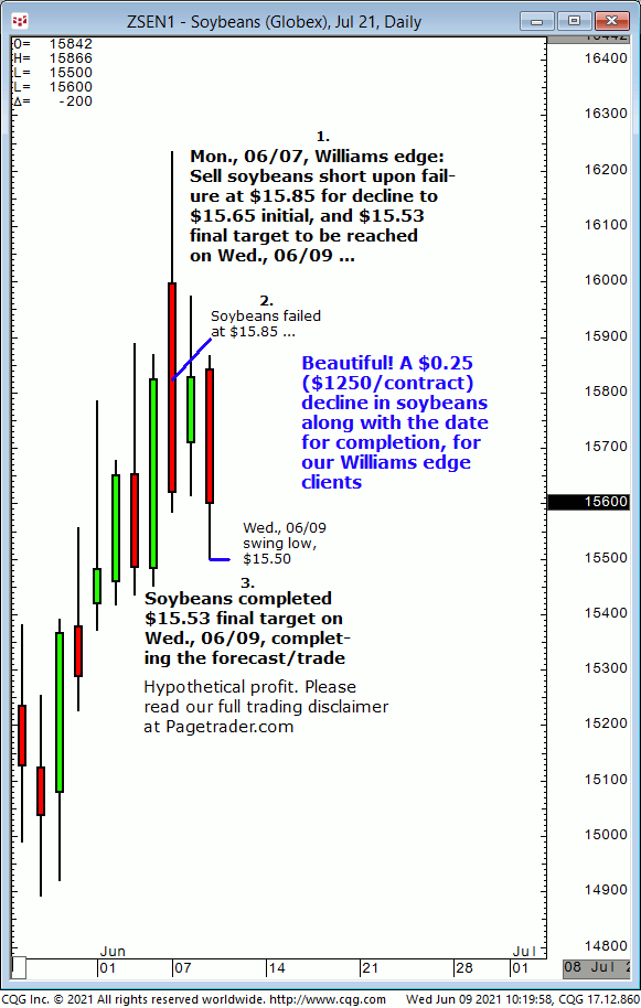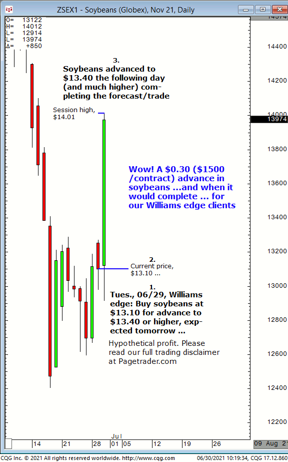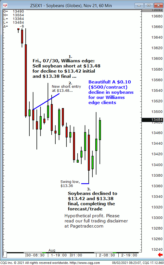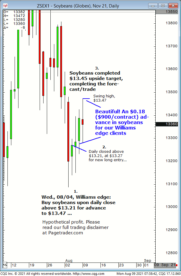 Our Wed., 08/04 soybean call was for new entry upon daily close above $13.21 for advance to $13.45. Results? Soybeans closed at $13.27 and today completed the $13.45 target! Trial at https://pagetrader.com/market-forecasting-products/williams-edge-futures-and-plus-1-week-trial/