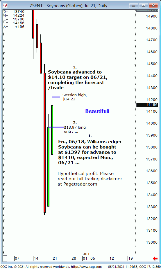 Our Fri., 06/16 soybean forecast was for new long entry at $13.97 for advance to $14.10, expected Mon., 06/21. Results? Soybeans advanced and today (06/21) completed the $14.10 target (session high, $14.22)!