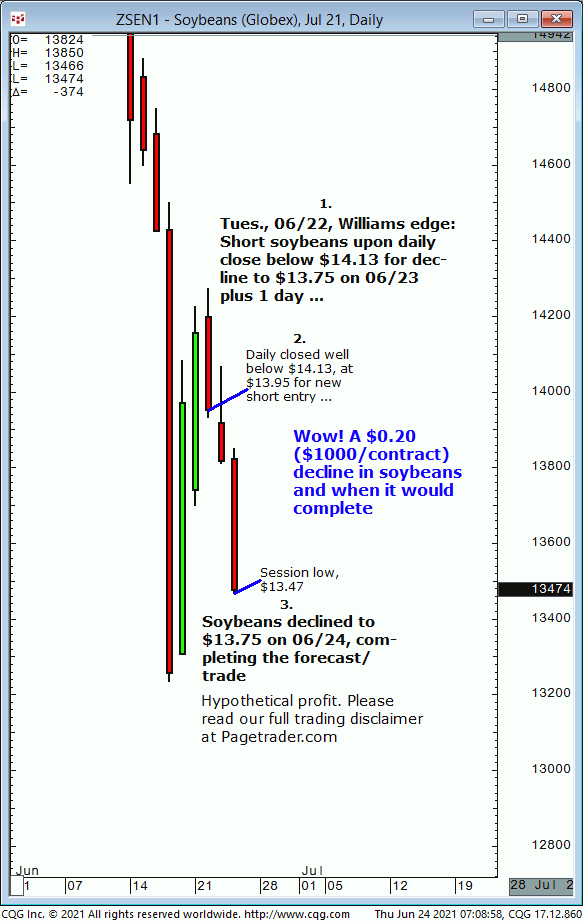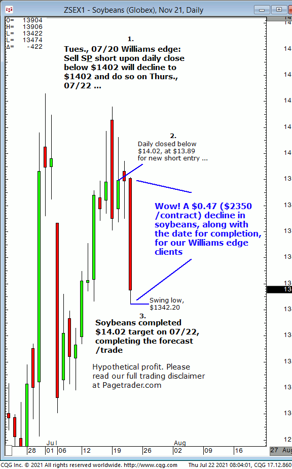 Our Fri., 07/30 soybean forecast was for new short entry at $30.48 for decline to $13.42 and $13.38 final. Results? Soybeans declined to the $13.38 target! Trial at https://pagetrader.com/market-forecasting-products/williams-edge-futures-and-plus-1-week-trial/