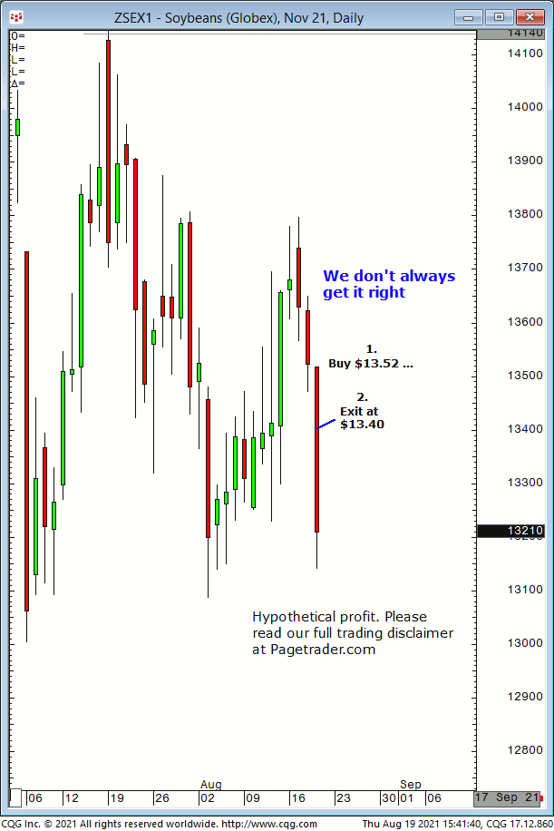 We don’t always get it right. Our long position at $13.52 in soybeans was stopped out at $13.40, resulting in a loss. Trial at: https://pagetrader.com/market-forecasting-products/williams-edge-futures-and-plus-1-week-trial/