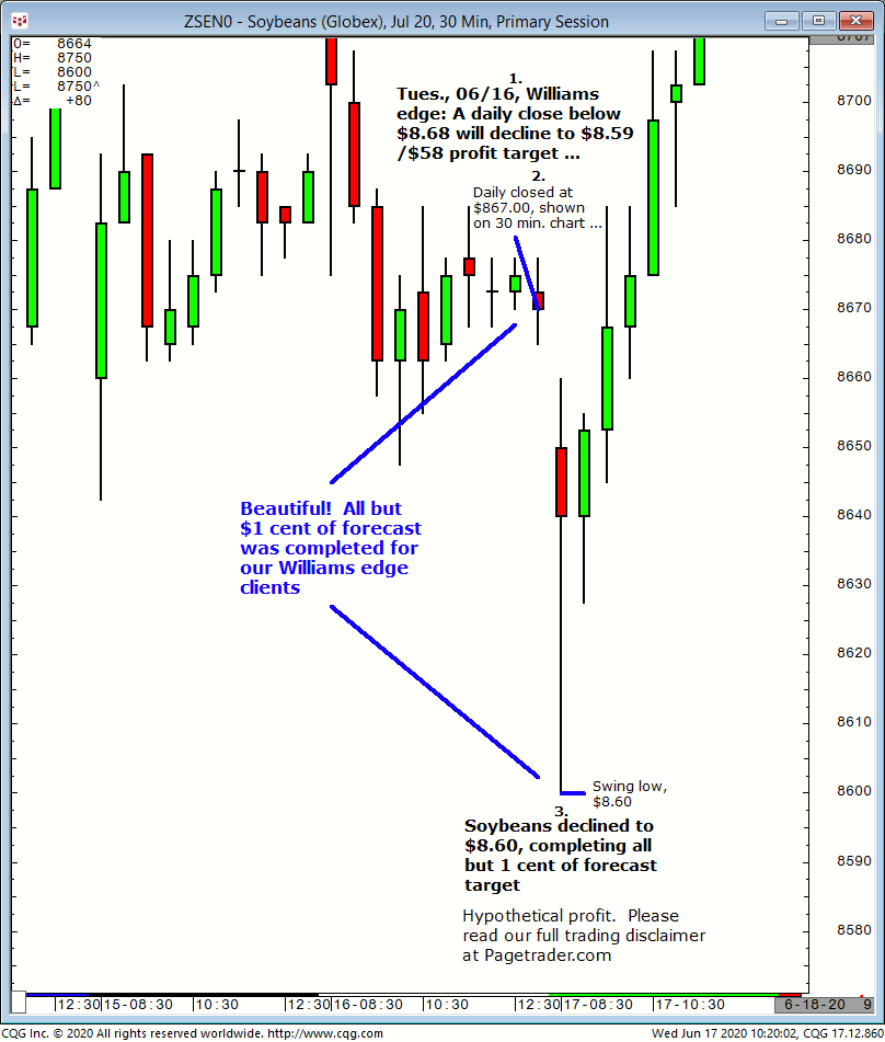 July soybeans: 1. In Tuesday 06/16 Williams edge session it was noted that a daily close below $8.68 would decline to $8.59/$58 profit target. 2. Subsequently, the daily closed at $8.67 for new short entry. The market then declined and the following day completed all but $0.01 of the forecast $8.59/$58 profit target, with the