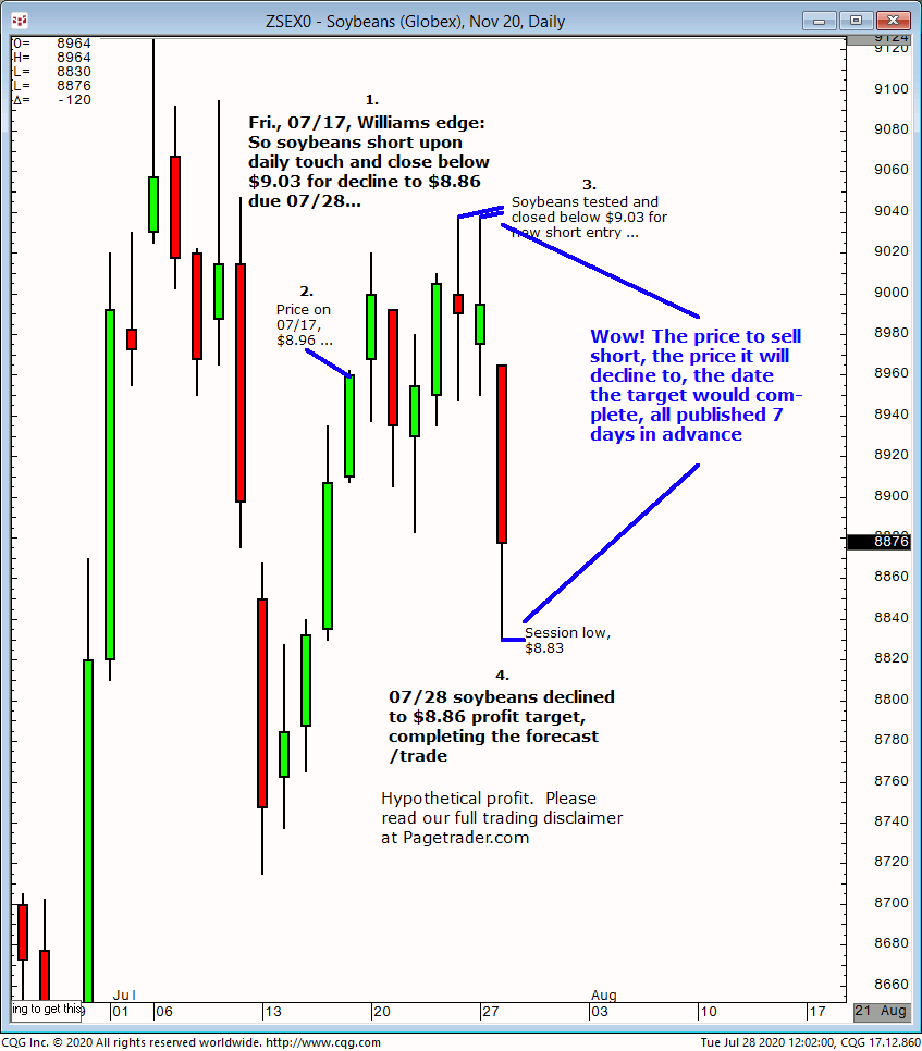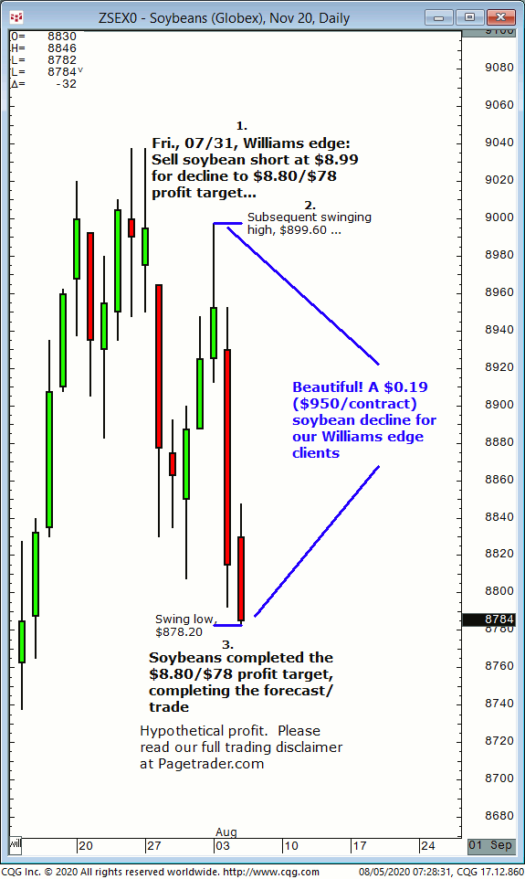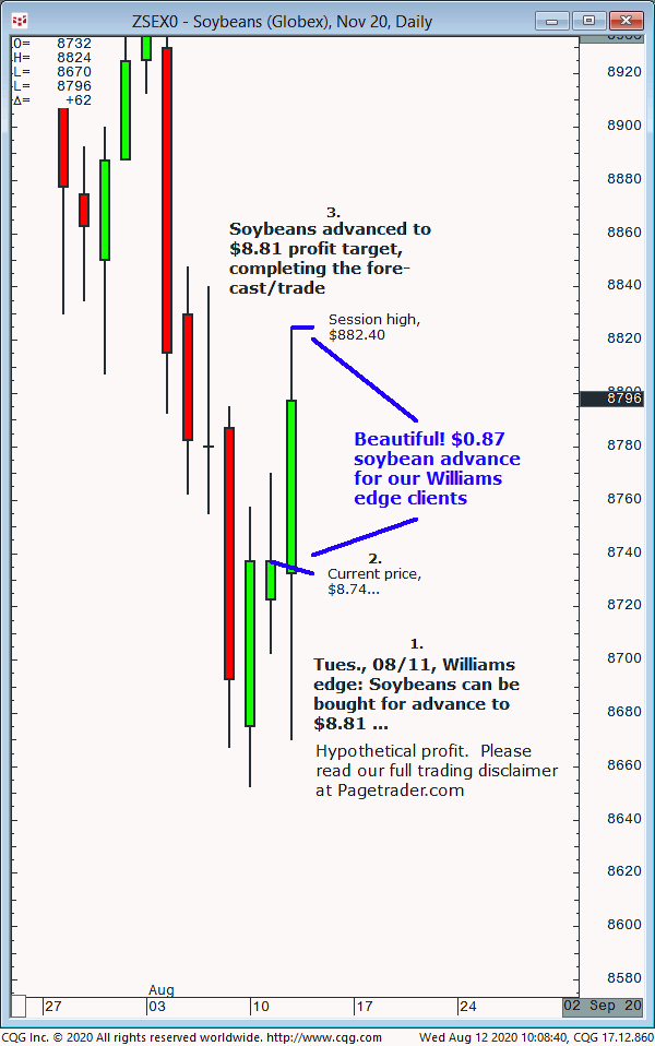 November soybeans: 1. In Tuesday 07/14 Williams edge session it was noted to buy November soybeans upon a daily close above $8.78 for a tradable advance $8.86 initial, and $8.92/$93 final profit target. 2. Subsequently, the purchase was made at $8.78 and soybeans advanced and completed the $8.92/$93 profit target. This successfully completes the forecast/trade.