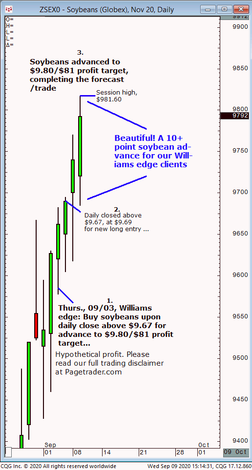 1. In Thursday 09/03 Williams edge session it was noted to by November soybeans upon a daily close above $9.67, for advanced and $9.80/$81 profit target. 2. Subsequently, soybeans closed above $9.67, at $9.69 for new long entry. The market than advanced and completed the $9.80/$81 profit target. This successfully completes the forecast/trade. David Williams