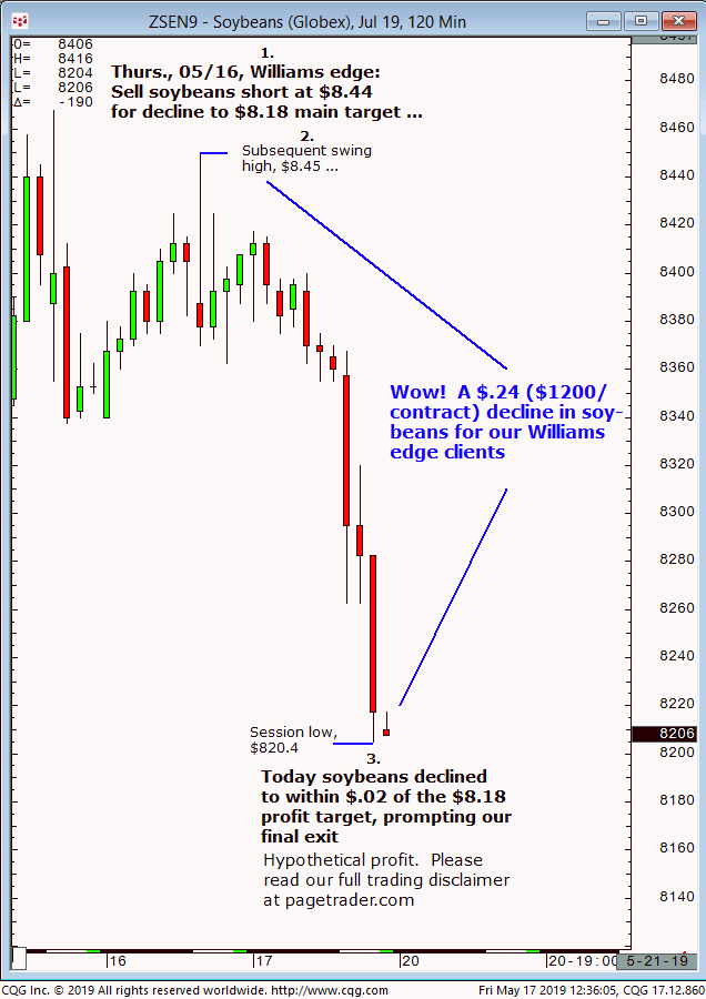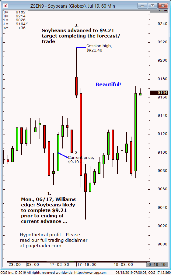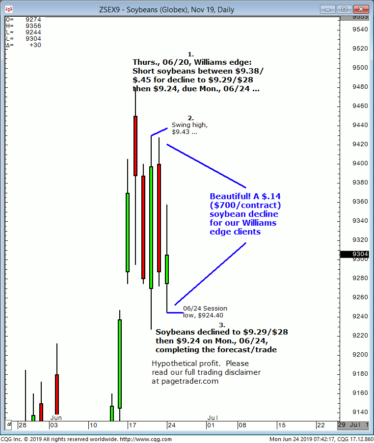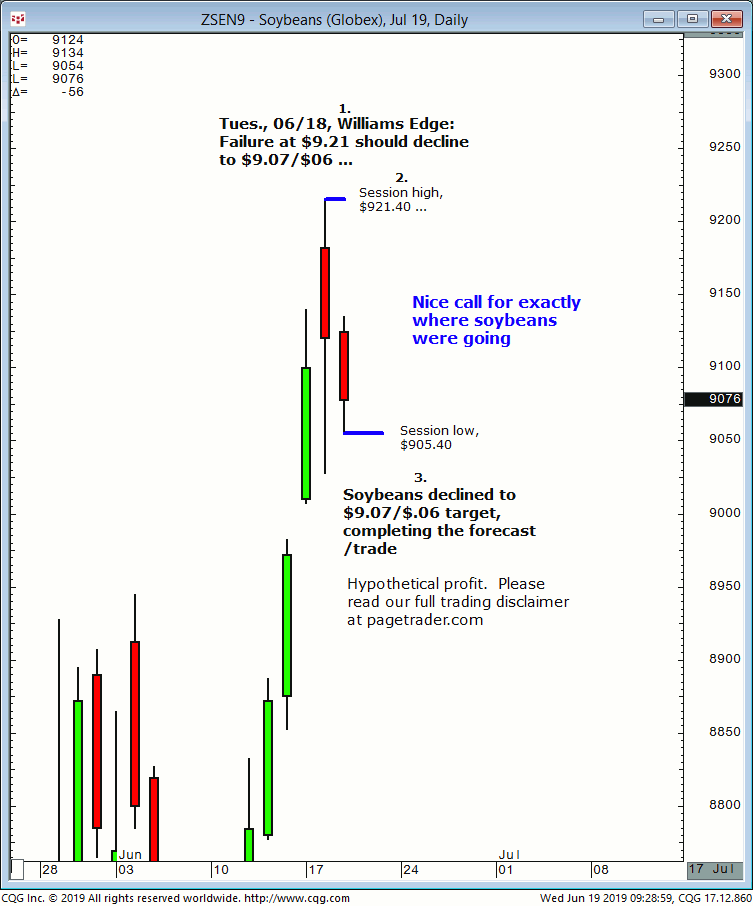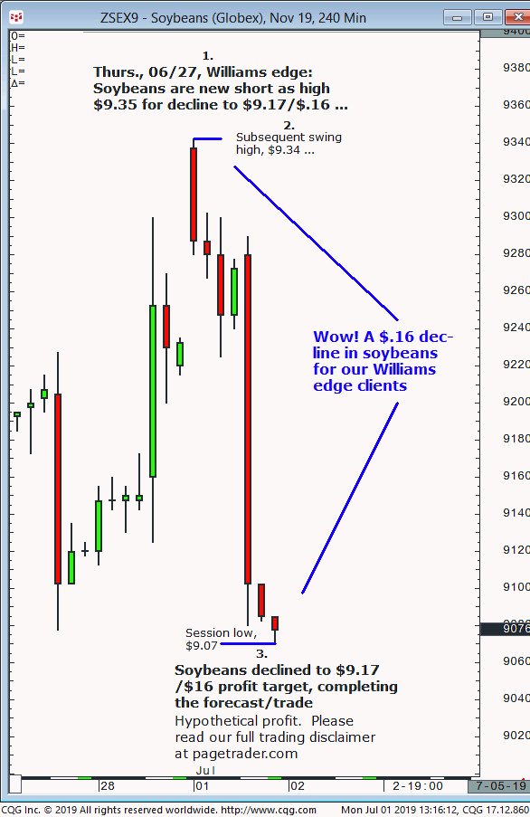 November soybeans: 1. Last Thursdays (06/27) Williams edge session it was noted that September soybeans could be shorted up to $9.35 for an expected decline to $9.17/$16. 2. Subsequently, soybeans made a swing high of $9.34 then reversed lower and completed the $9.17/$16 downside target. This successfully completes the forecast/trade. David Williams