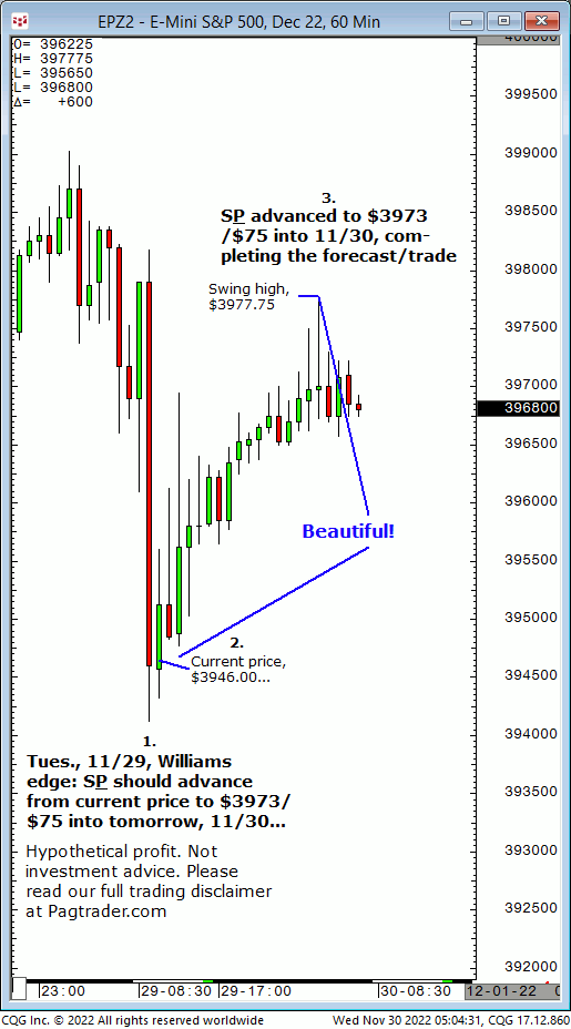 Tues., 11/29: S&P should advance from current price of $3946 to $3973/$75 into tomorrow, 11/30. Result? The S&P advanced from $3946 up to $3973/$75 into Wed., 11/30!