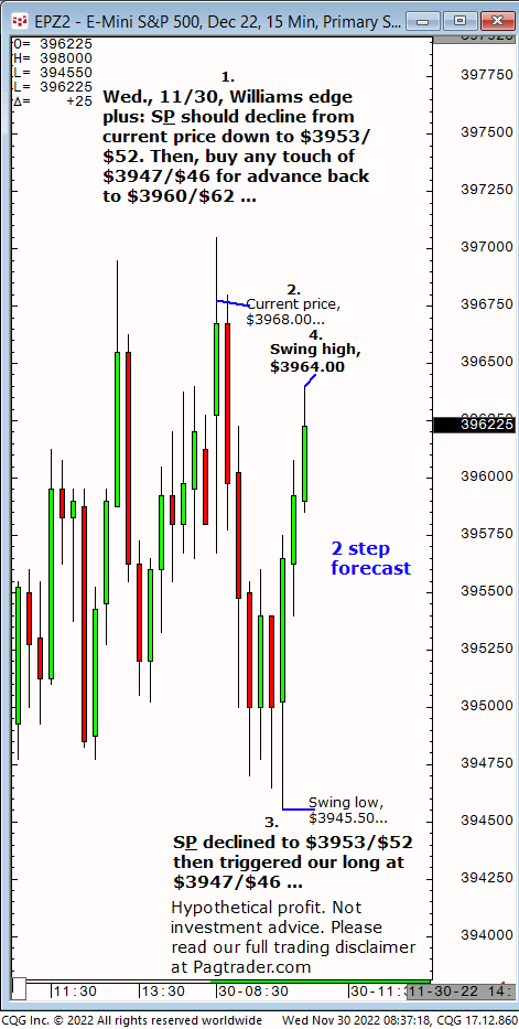 Wed.,11/30: S&P should decline from $3968 to $3953/$52. Then buy touch of $3947/$46 for run back to $3960/$62. Result? S&P declined from $3968 to $3953/$52, then touched $3947/$46 and ran to $3960/$62!okay