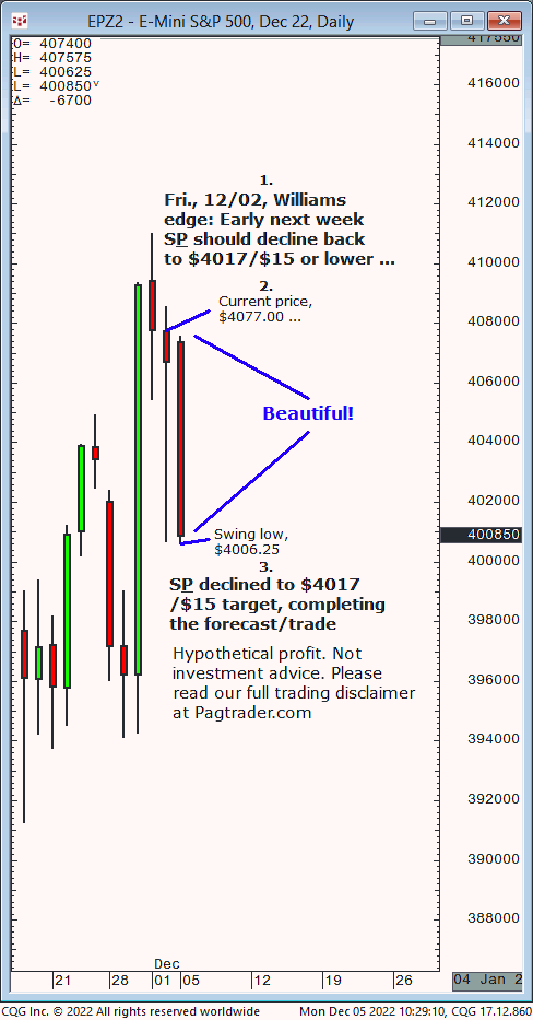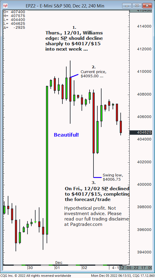Thurs., 12/01: S&P (at $4095) should decline sharply to $4017/$15 by next week. Result? The S&P declined sharply the following day (Fri., 12/02) completing the $4017/$15 target (swing low, $4006.75)!
