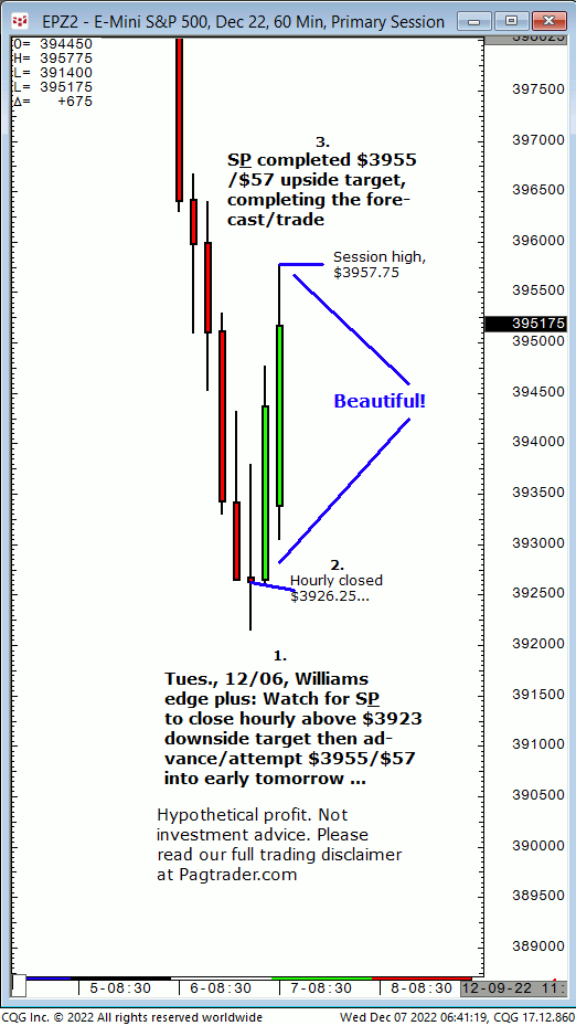 Wed., 12/07: Today’s completion of yesterday’s $3957 target should reverse to $3926/$25. Results? The S&P reversed from $3957.75 down to $3926/$25 (swing low, $3924.25)! Pagetrader is now in its 24th year providing market forecasts like this!