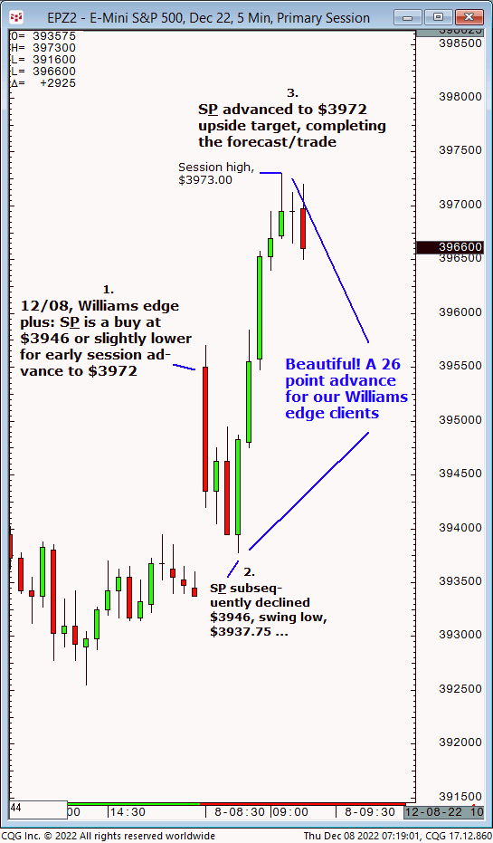 Thurs.,12/08: S&P is a buy at $3946 or slightly lower for early session advance to $3972. Result? The S&P made a subsequent swing low of $3937.25 then quickly reversed and completed the $3972 early session target (swing high, $3973.00)!