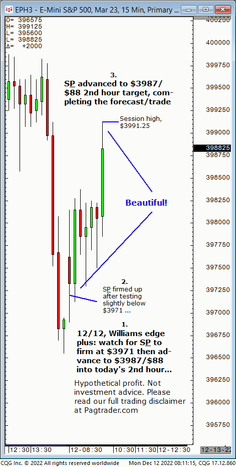 Mon., 12/12: Watch for S&P to firm up at $3971 then advance to $3987/$88 into today’s 2nd hour. Result? The S&P made a subsequent swing low of $3969 then advanced to $3987/$88 into today’s 2nd hour (swing high, $3991.25)!