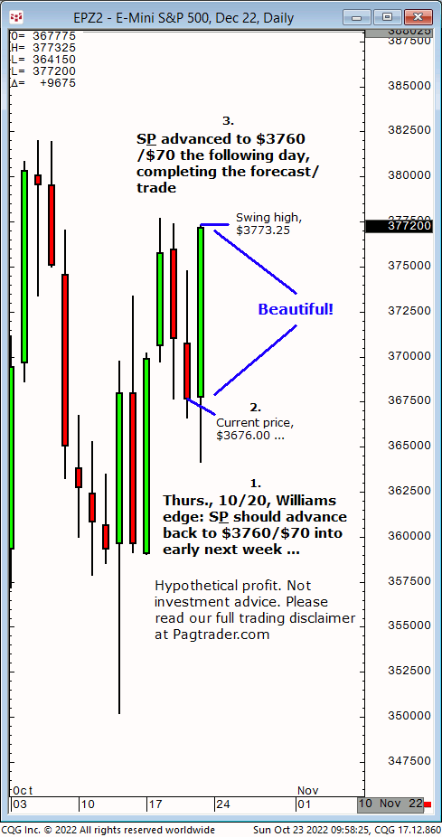 Thurs., 10/20: S&P should advance from $3676 to $3760/$70 into early next week. Result? S&P quickly advanced to $3760/$70 the following day (swing high, $3773.25)!