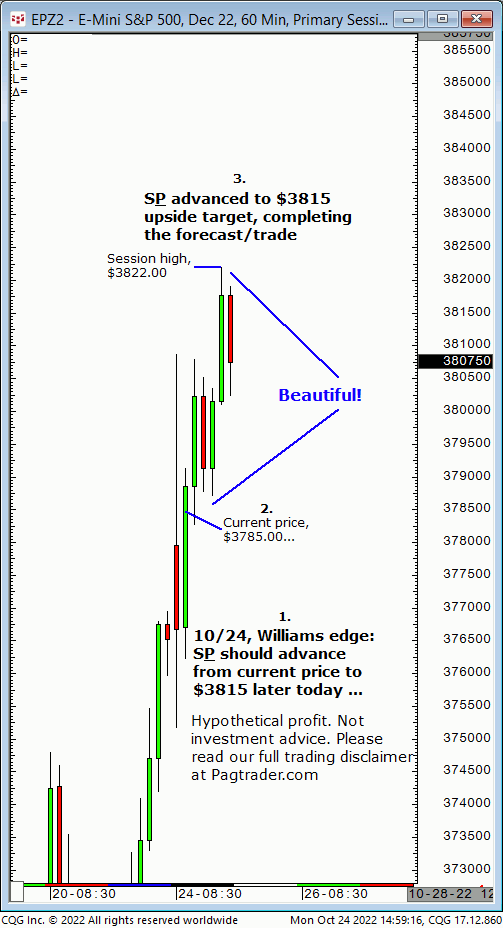 Mon., 10/24: S&P should advance from $3785 up to $3815, later today. Result? The S&P advanced to $3815 late in the session (swing high, $3822.00)!