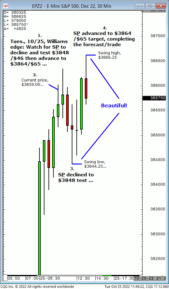 Tues.,10/25: Watch for S&P to decline from $3859 down to $3848/$46, then advance to new highs at $3864/$65. Result? The S&P declined to $3844.25 then advanced to $3864/$65 target (swing high, $3866.25)!