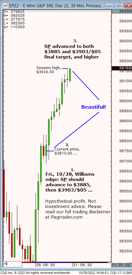 Fri.,10/28: S&P should advance from $3885, then $3903/$05. Result? The S&P advanced from $3875 to $3885, then $3903/$05 (session high, $3916.50)!
