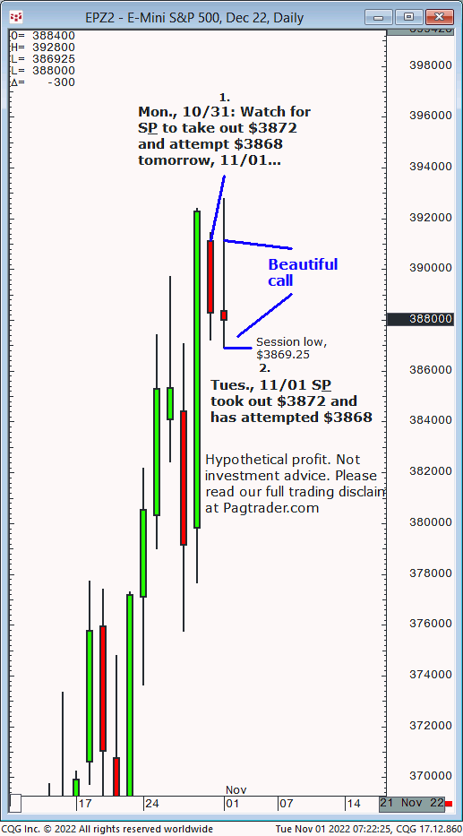 Mon., 10/31: Watch for S&P to take out $3872 and attempt $3868 tomorrow, 11/01. Result? Today (11/01) the S&P declined sharply, took out $3872 and attempted $3868 as forecast session low, $3869.25!