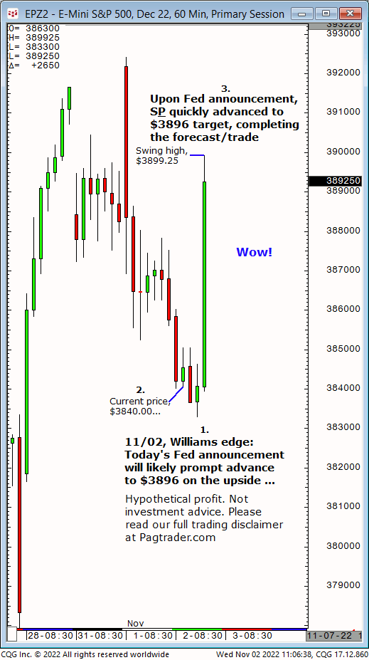 Wed.,11/09: $3793/$92 is buying territory for advance to $3808. Result? The S&P made a subsequent swing low of $3788.25 then completed the forecast $3808 upside target (swing high, $3808.50)! You could have known too!