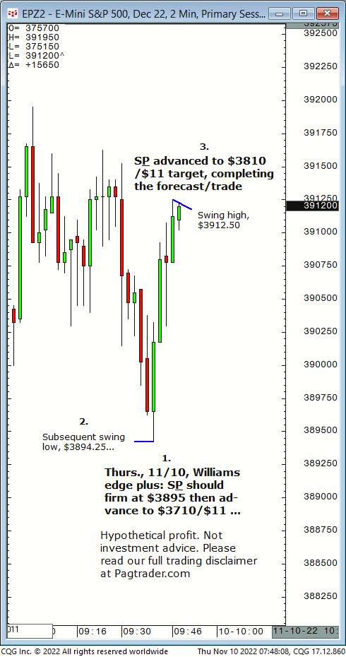 Thurs.,11/10: S&P should firm up at $3895 then advance to $3910/$11. Results? The S&P made a subsequent swing low of $3894.25 then reversed and completed the $3910/$11 target! You could have known!