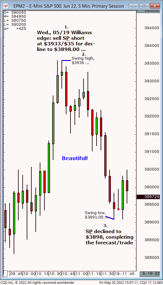 Wed., 05/19: Sell S&P short at $3933/$35 for decline to $3898. Results? The S&P declined from $3933/$35 to $3898!