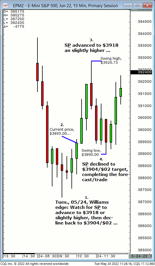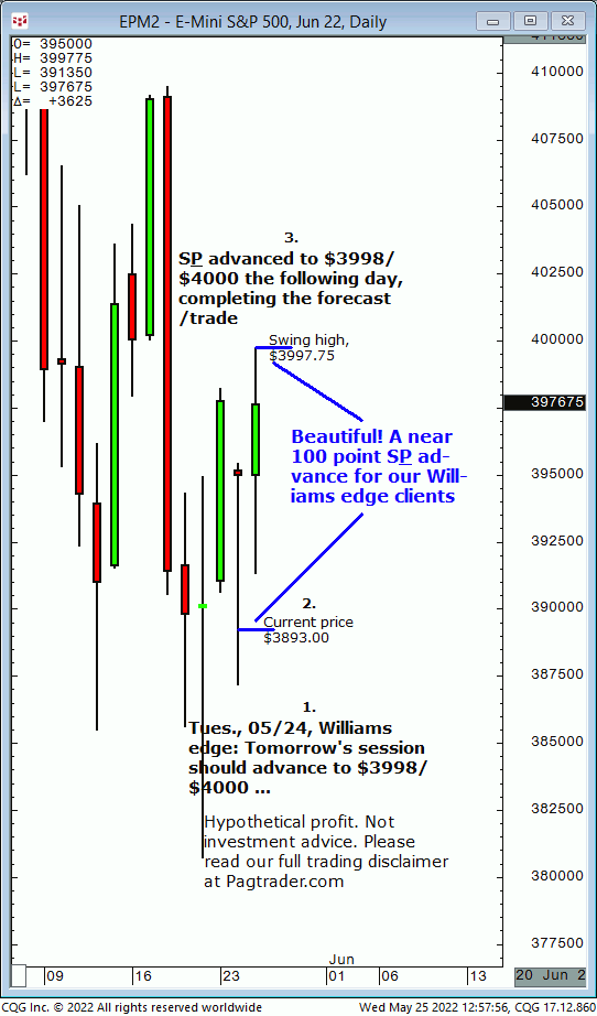 Tues., 05/24: S&P should advance from current price to $3998/$4000 into tomorrow’s session . Result? The S&P advanced from $3893 to $3998/$4000 the following day!